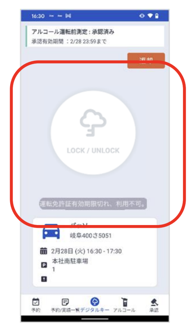 例えば運転免許証の有効期限が切れている場合は、スマートフォンの専用アプリに下記の画面が表示され、デジタルキーが作動しない仕組みになっています。