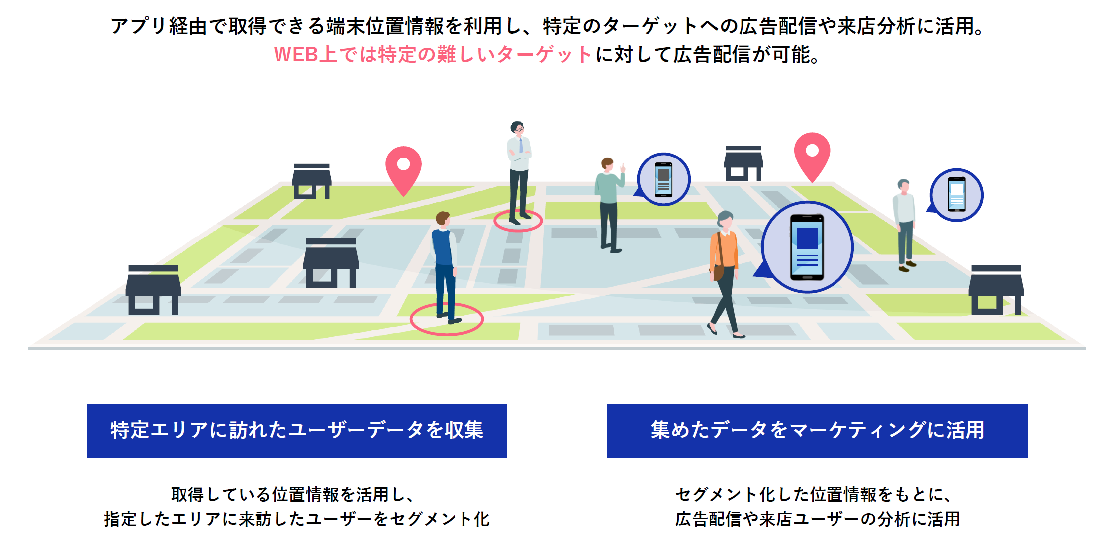 位置情報を活用した広告配信サービスは、アプリ等を通じて取得された端末の位置データを活用し、特定のターゲットに対して効果的に広告を配信できるツールです。
