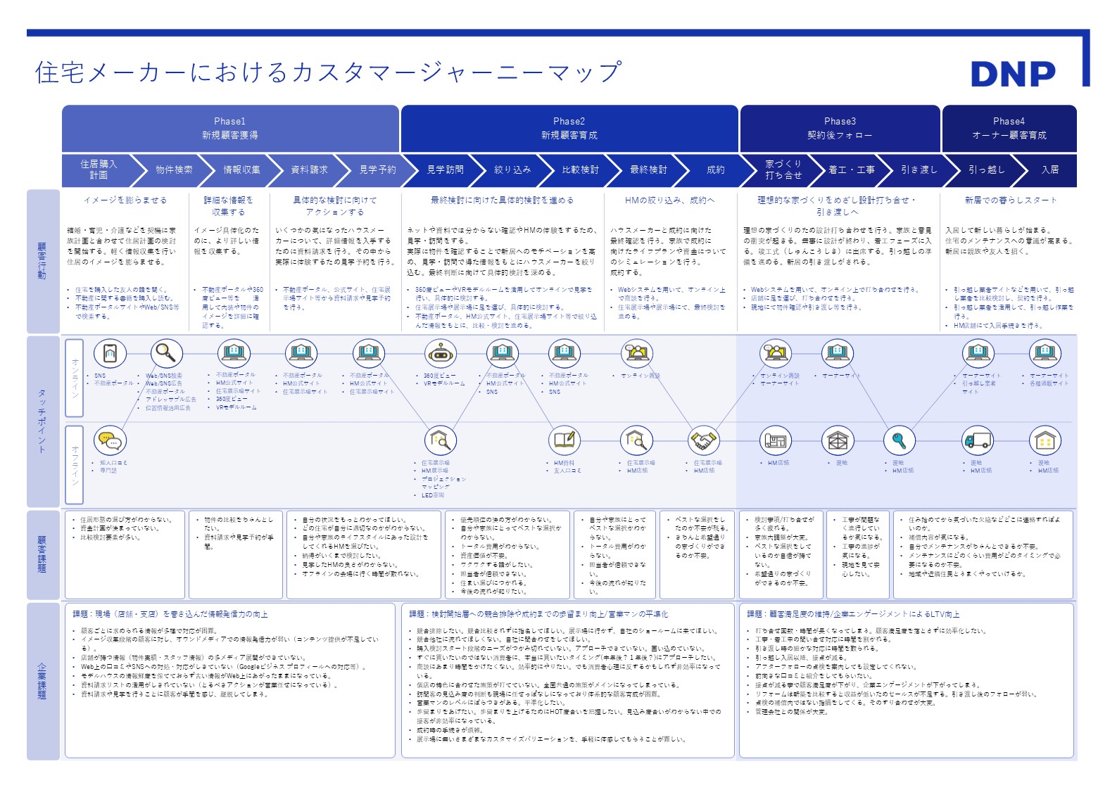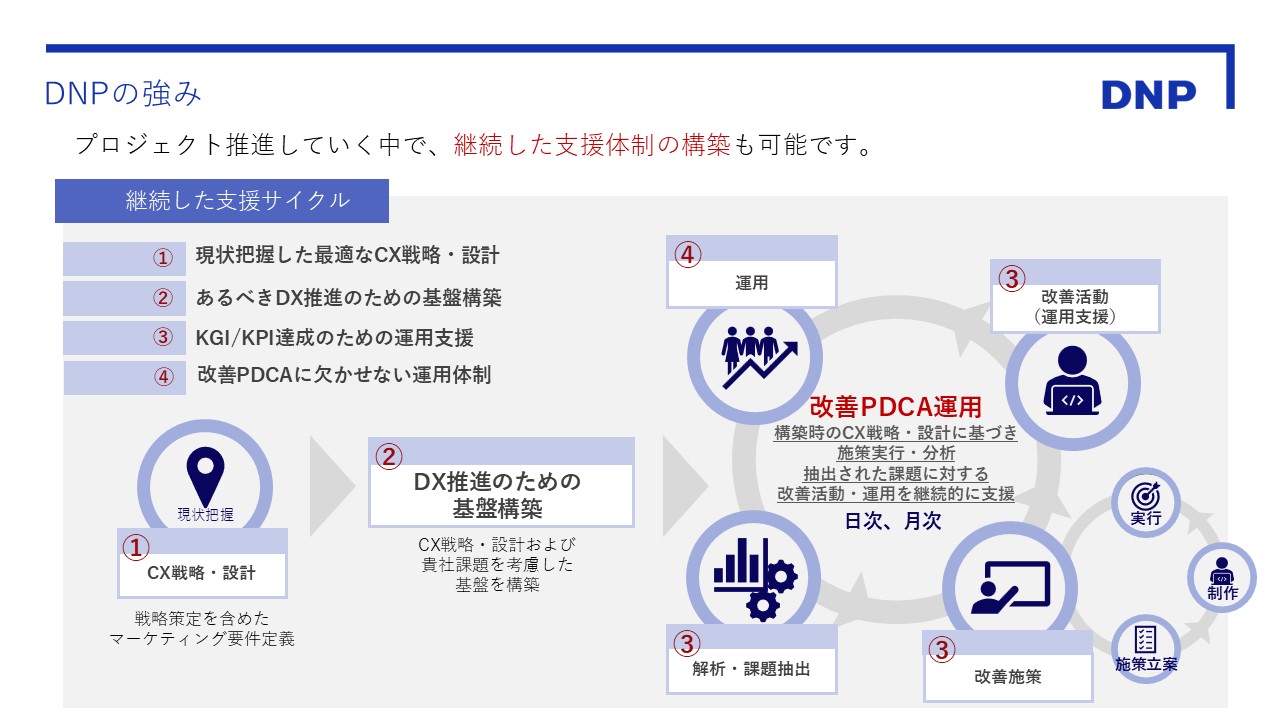 DNPは、現場施策や業界に対する深い知見を活用して、お客さまの思いを実現する「伴走型のアプローチ」を得意としています。上流から下流まで、包括的なサポートが可能です。