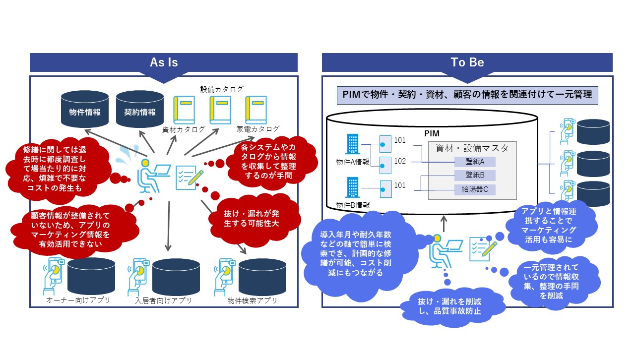 PIMシステムを導入することで、各部門やチャネルに分散していた製品・物件データを統合できます。カタログやWebサイトへの迅速な情報反映が可能となり、業務の効率化につながるでしょう。また、情報の統一性が確保されるため、顧客に対して誤った情報を提供するリスクが低減され、カスタマーエクスペリエンスの向上にも貢献します。