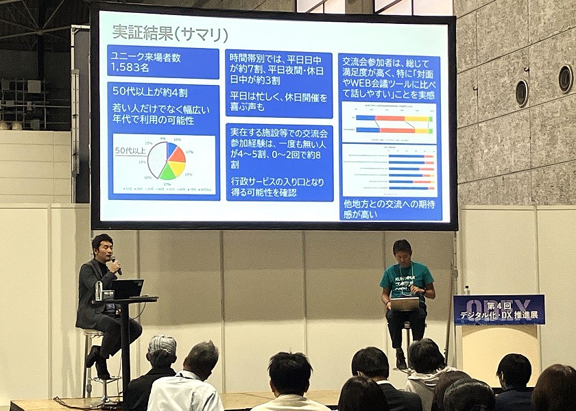 今年の2月から3月、8月から9月にかけて2回の実証が行われました。8月・9月の実証では、桑名市と新潟県三条市の共同利用モデルが試され、約1,600名のユニーク来場者がありました。特に50代以上の利用者が約4割を占め、高齢者にも使いやすいサービスであることが確認されました。