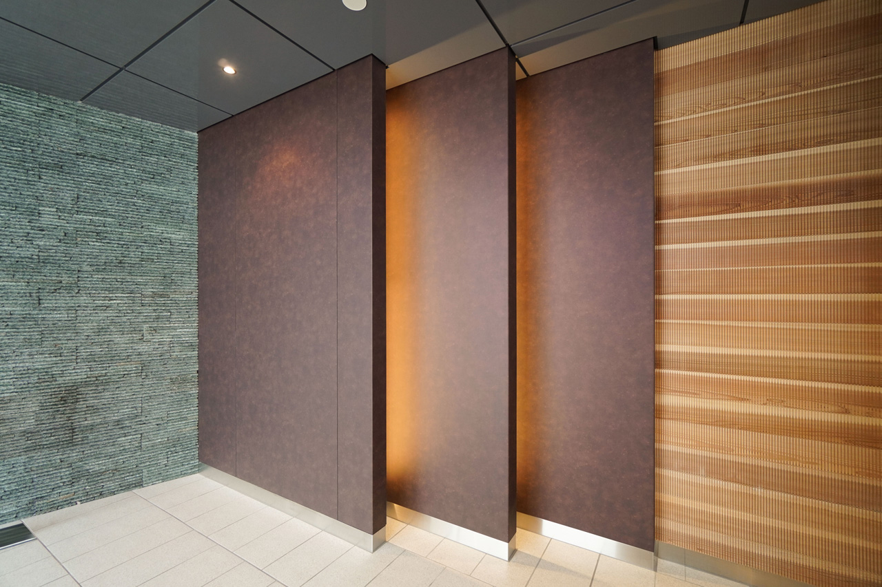 」では、エントランス部分の壁面にコールテン鋼柄のアートテックパネルが採用されました。3枚の壁で空間に奥行きを生み出し、暖色系のライティングによってパネルの表情を引き立てています。金属柄でありながら、温かみを感じられるエントランスとなっています。