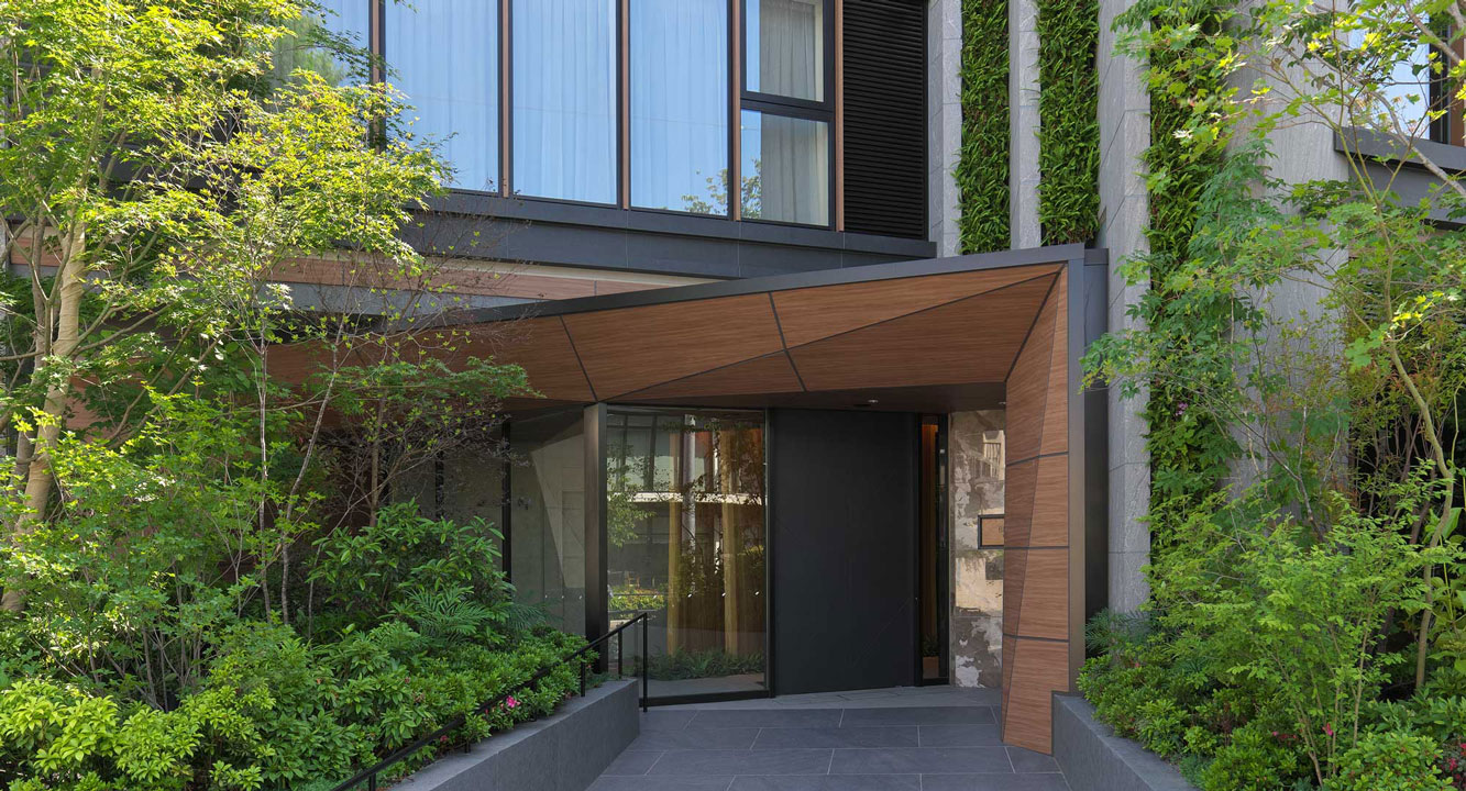 黒を基調としたデザインに自然な木目柄のパネルと緑の植栽が組み合わさり、高級感あふれるエントランスを実現しています。