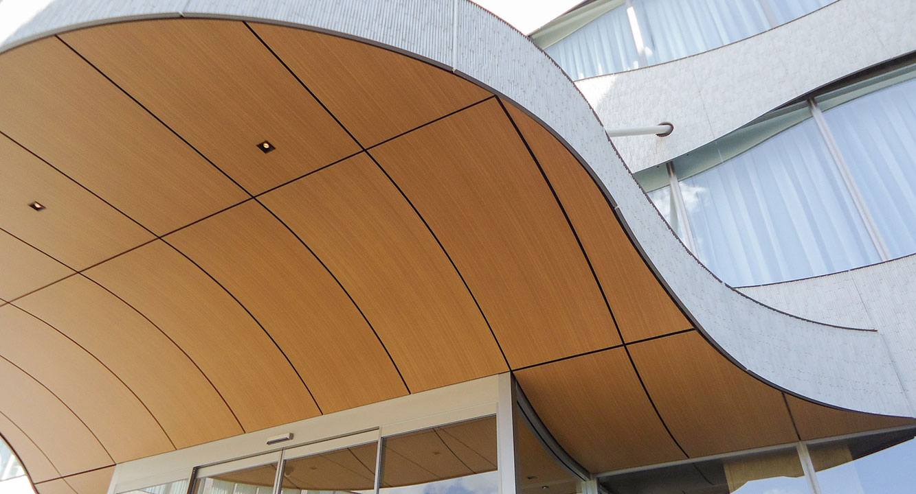 」は、R加工で大きくカーブした車寄せの庇が特徴的な建物です。この庇の軒天に使用されているのが、竹モチーフの意匠のアートテックです。印刷ならではの技術で、大きなパネルに竹の質感が表現されています。