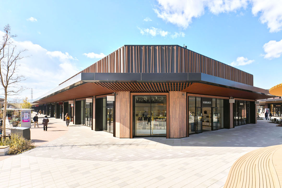 アートテックは本物の木のような温かみのある意匠を実現しながらも、実際の木材では難しい耐候性・耐久性を実現できる特徴があります。ふかや花園プレミアム・アウトレットのように屋外に面した店舗には、高い耐候性・耐久性が求められることから、アートテックは大いに素材としての実力を発揮。建物の他の意匠との調和も取れ、落ち着いたデザインとなりました。