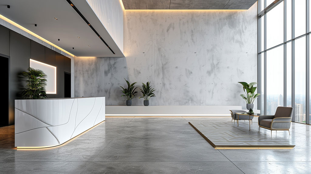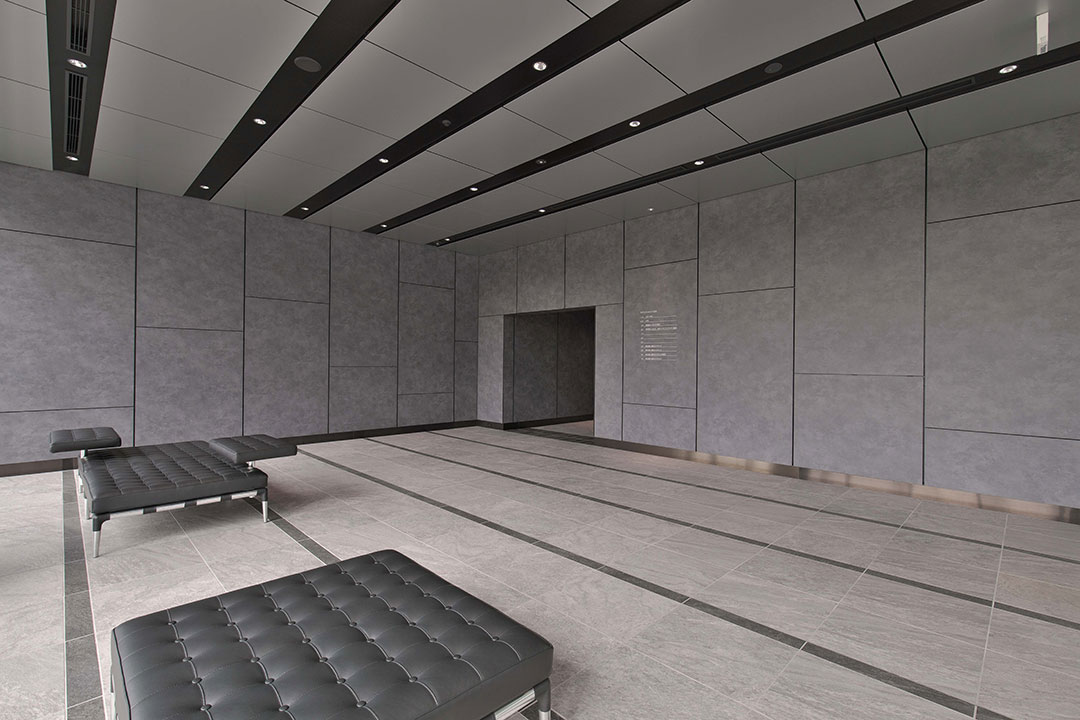 アートテックは印刷ならではの技術で、実際にはない質感・素材感の意匠を可能とします。長谷工南砂町駅前ビルで採用されているのもその一つです。エントランスホールの壁全体にアートテックのパネルを使用していて、シンプルながらも統一された空間には高級感が演出されています。