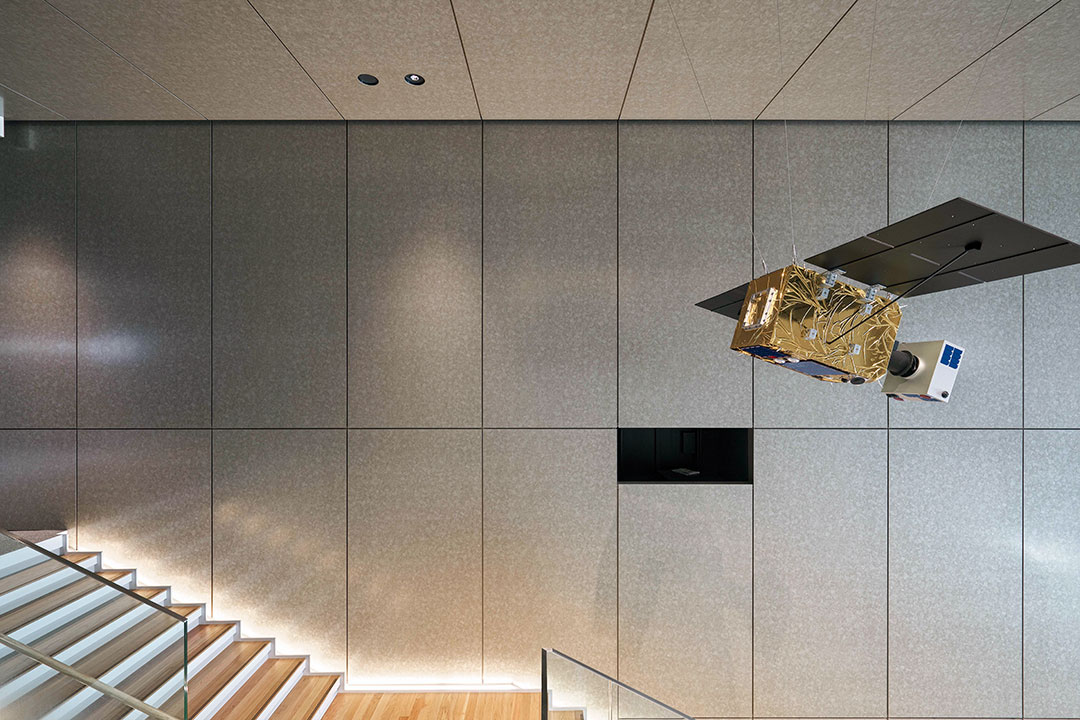 エントランスホールの内装には、木目柄のパネルとあわせて、リン酸柄エリオ鋼板のアートテックがルーバー形状で採用されています。シンプルなデザインに和の自然素材を組み合わせた、注目のデザインといえるでしょう。