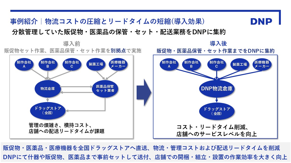 販促資材と医薬品を一括管理し、物流コスト削減とリードタイム短縮を実現。