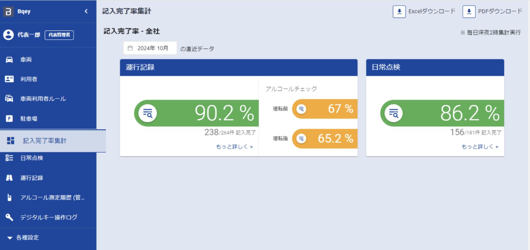 この課題を解決するのに有効な手段が、Bqeyに搭載されている記入完了率集計機能・ダウンロード機能の活用です。Bqeyは、運行記録、日常点検やアルコール検査記録の進捗状況を自動集約し、記入完了率の推移をデータ化することで管理者の業務効率化や管理体制の強化を実現できます。