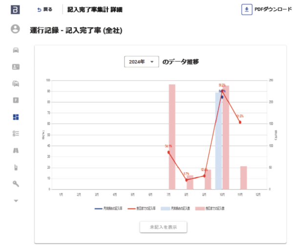 運行記録や日常点検における記入完了率の推移は、あらかじめ設定された管理者の権限に応じた範囲(企業全体・部署)をPDFファイルとしてダウンロード可能です。管理画面でも記録の推移をひと目で確認できます。