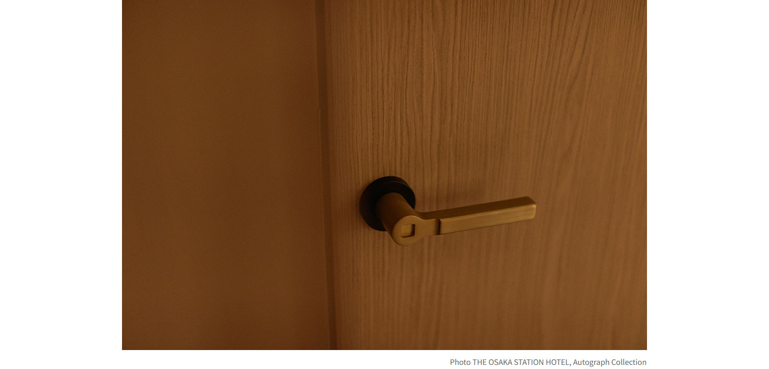 ヘッドボードのフレームや客室内にあるドアのエッジなど、アクセントにゴールドのメタル素材が使われています。ホテルカラーの真鍮ゴールドを基調としたデザインです。扉のレバーハンドルも、電車のブレーキレバーをモチーフとしたオリジナルデザインです。エレガントなモダンスタイルの客室スタイルですが、随所に大阪らしさが表現されていました。