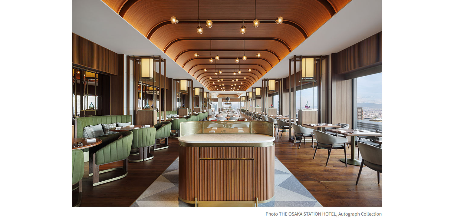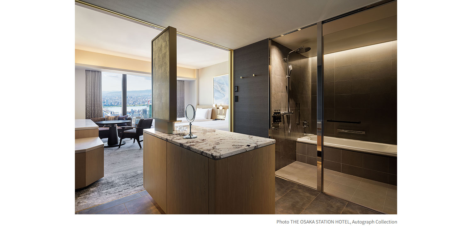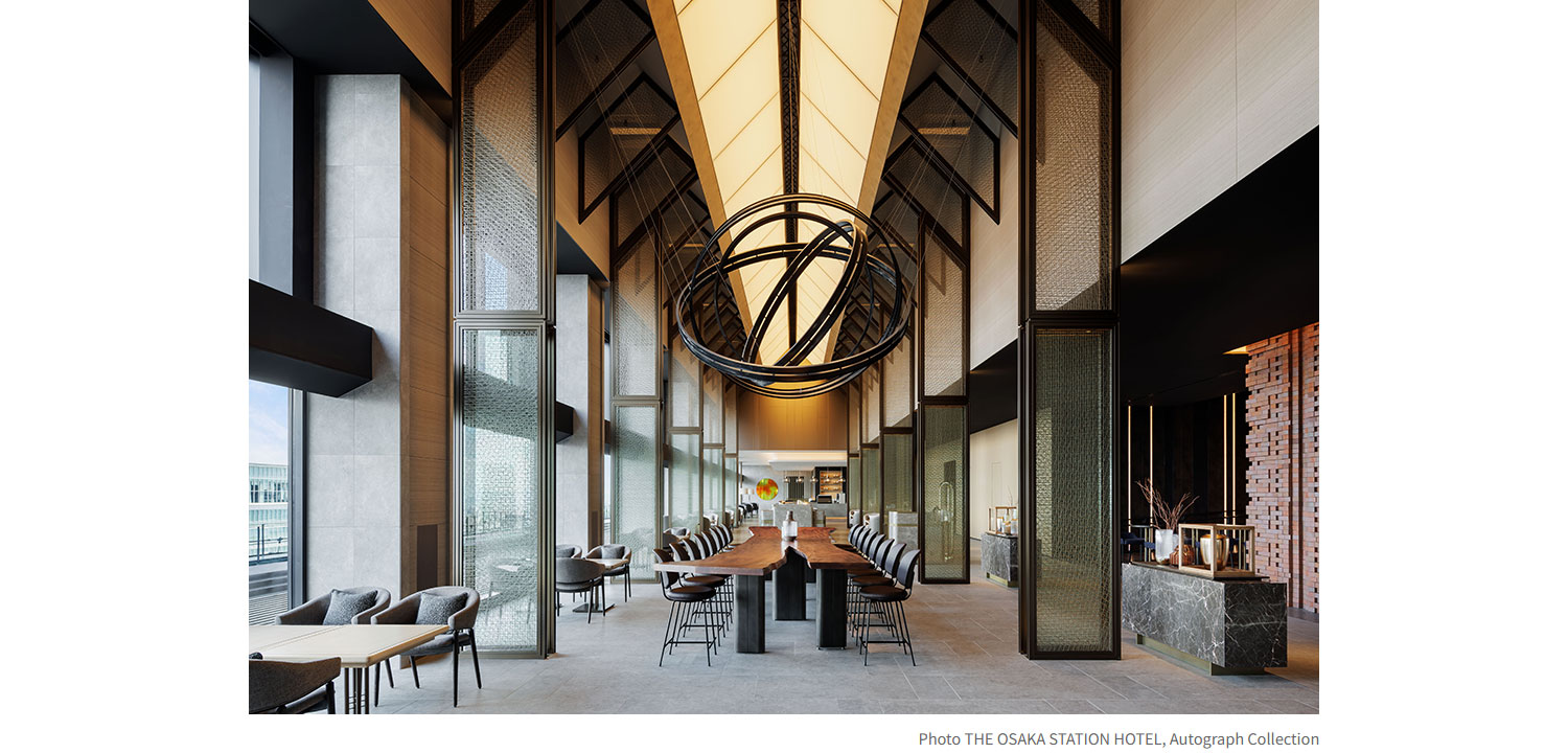 THE OSAKA STATION HOTEL, Autograph Collection はJR大阪駅西口に直結した「JPタワー大阪」内に2024年7月31日に開業しました。1874年に初代大阪駅が開業した地であり、この大阪で紡がれてきた歴史や文化、その価値を未来へと継承していくことをブランドコンセプト「THE OSAKA TIME」に込めています。ホテルデザインは、各エリアを巡ることで生まれたTime Travel(時空の旅)というストーリーによって、大阪の歴史、文化、体験からインスパイアされたさまざまな工芸や素材によって創り込まれ、「鉄道・駅の記憶」を大切な誇りに、唯一無二の体験を提供しています。設計・デザインは、乃村工藝社、日建設計、FOO、安井建築設計事務所などが担当しています。