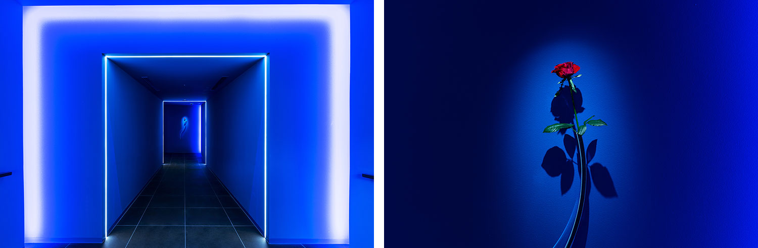 階段をあがる必要があったエントランスは、1階から段差なく直接アプローチ可能にリニューアルされました。中に入ると、「結界」をイメージした青一色の没入感のトンネルが広がり、つきあたりにバラのオブジェを見ることができます。青色の空間に赤色のバラ、緑色の葉で、ホテルのメインカラースキームである3つのカラーを再現しています。