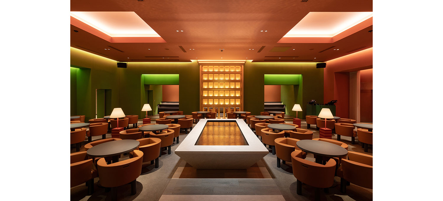 ブルーの空間を抜けると、フロントエリア、ラウンジ「エル・ドラド」があります。開業当時、別棟に4つのバーがあり、そのうちの1つがアルド・ロッシがデザインしたバー「エル・ドラド」でした。リニューアルされたラウンジには、そのバー「エル・ドラド」から内装の一部を移築しています。中央に位置する黄金のモニュメント「ファサード」はバーでボトル棚として使用していたものです。