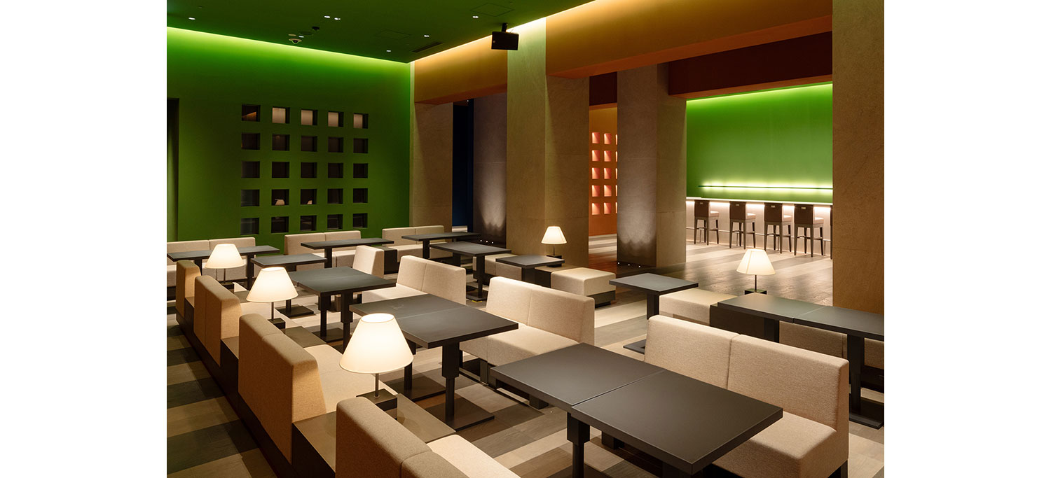 レセプションエリアはグリーンの空間で、バーカウンターも兼ねています。このグリーンカラーはホテルのロゴやアメニティなど随所でみることができます。フロアは2色のグレーカラーの木質が、50cm幅のストライプで構成されています。これは開業時にアルド・ロッシがこだわったポイントだそうです。