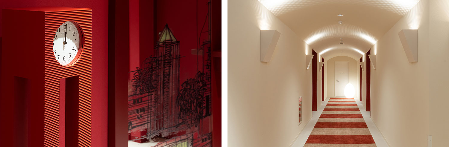 客室フロアの廊下はカラースキームの一つである赤で構成されています。エレベーターホールには、アルド・ロッシ氏によるドローイングがプリントされた鏡が設置されています。隣には、内田氏がデザインした時計「DEAR MORRIS」が置かれています。カーペットはレセプションエリアのフロアと同様に、赤と白の50cm幅のストライプで構成されています。