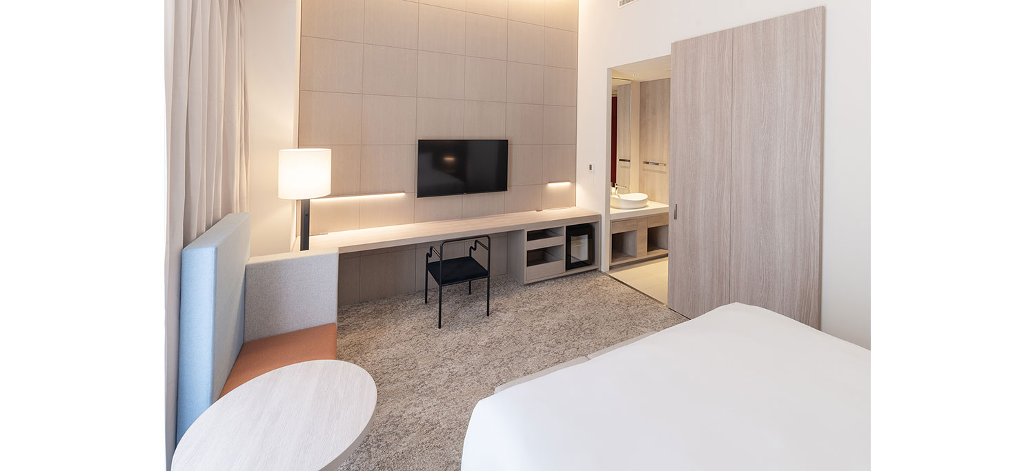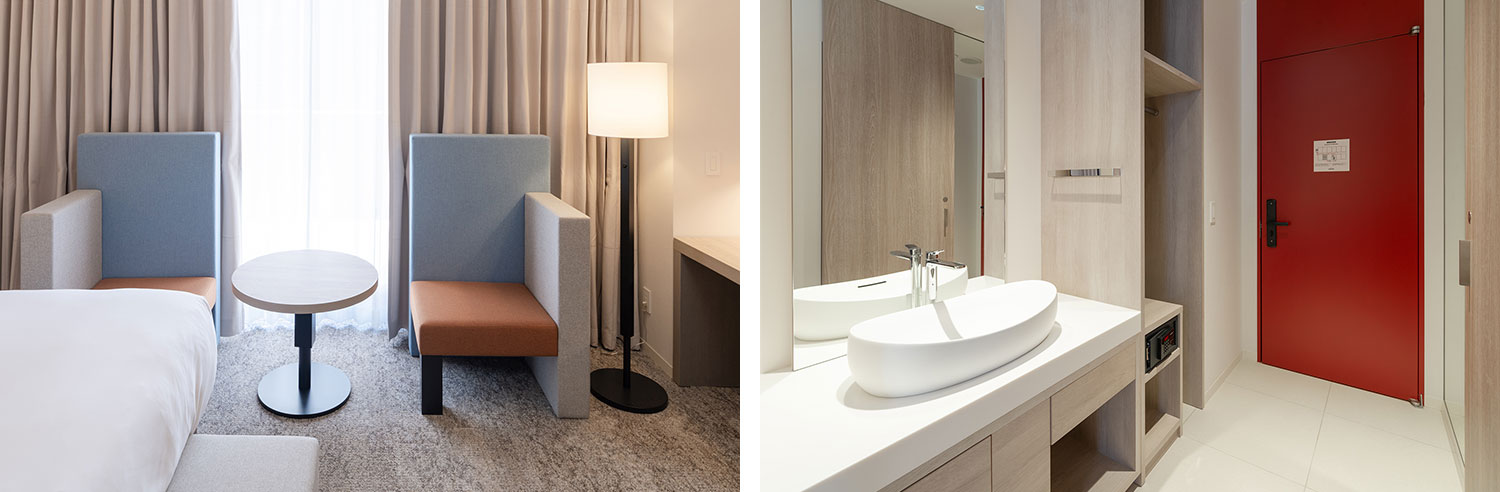 白を基調とした空間にグレイッシュな木目が空間にほどよいぬくもりを与え、共有部の華やかな空間と落ち着いた印象の客室が違和感なくつながっているように感じました。