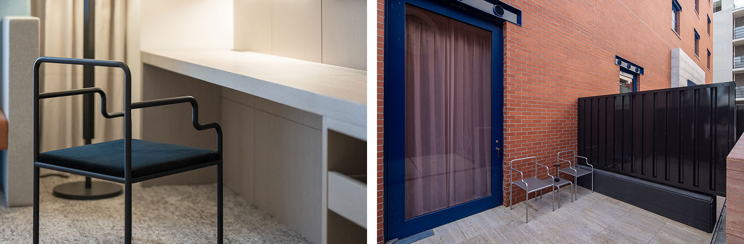 カウンターテーブルに設えられた黒色のチェア、バルコニーにあるシルバーのチェアは共に内田繫デザインの作品「FEB(フェブ)」をイル パラッツォに合わせて作られたものです。シンプルな構成でありながら、ジオメトリックなパターンを想起させ、しっかりと存在感を感じるデザインでした。