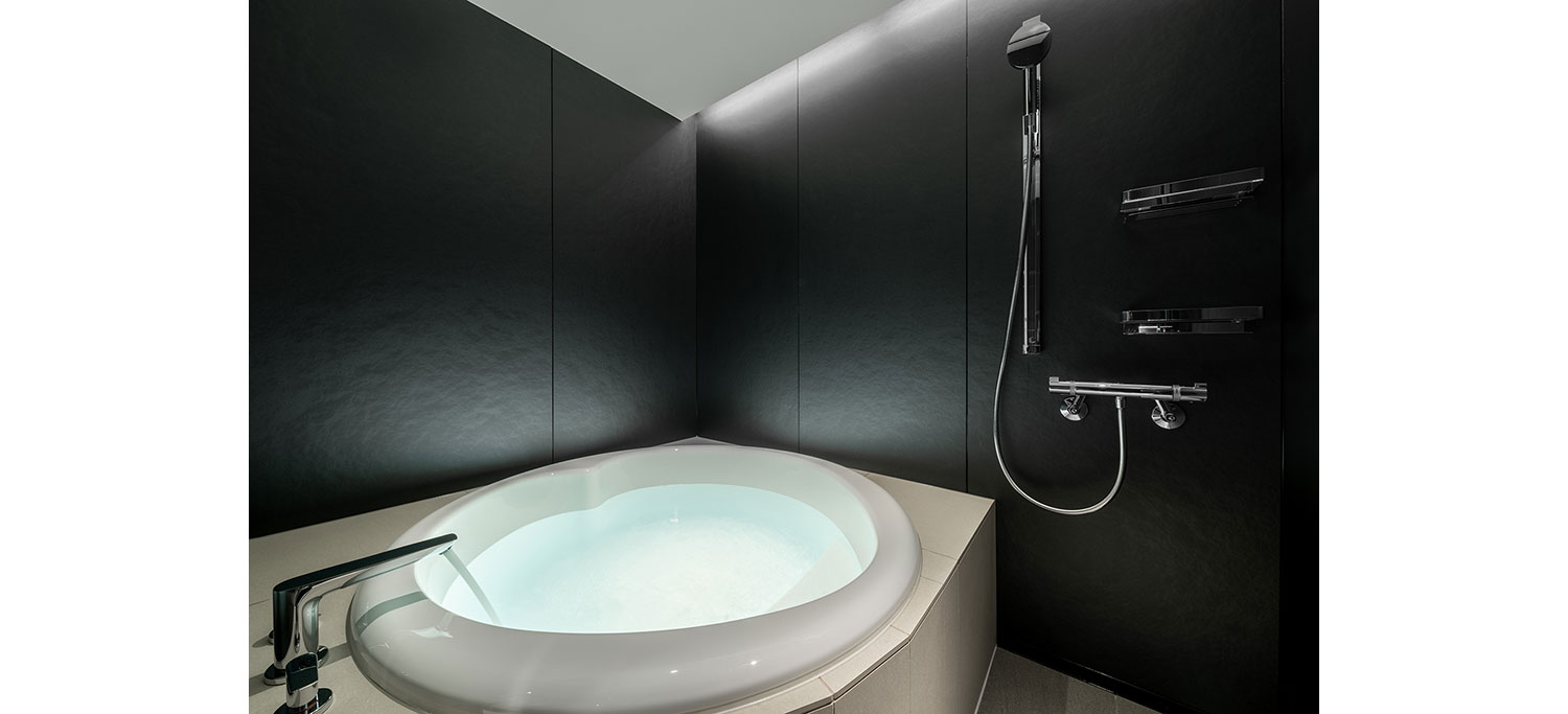 バスルームはゲストが安らぎを得るように黒のダークな空間に大きな円形のバスタブを採用しています。(このバスタブはデラックスキングのみです。)