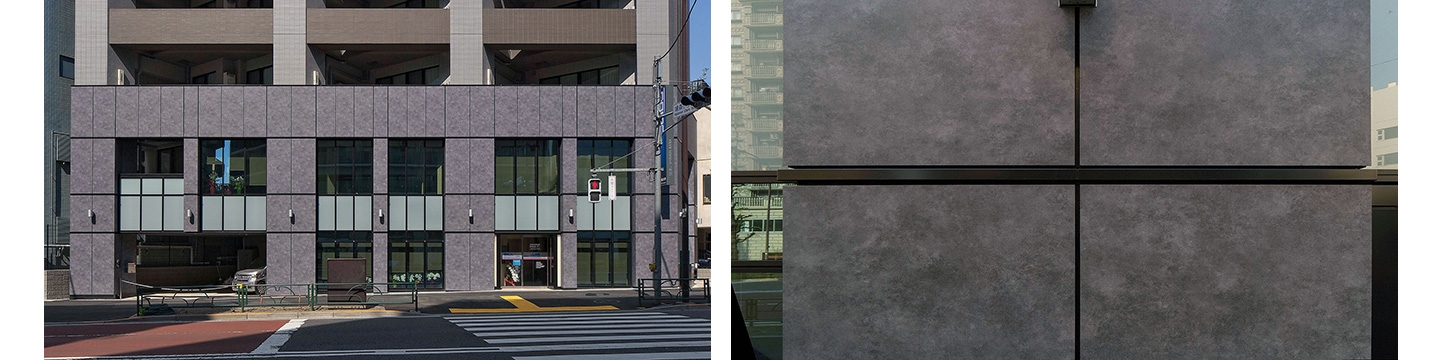 洗練されたラグジュアリーなイメージをコンセプトとした建物にふさわしい、アートテックと一般焼付ボーダーの組合せで、高級感を演出しています。1、2階部分の外装に石目調と金属調をかけ合わせたオリジナル柄のアートテックを採用しました。