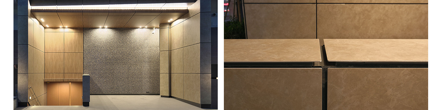 では、エントランス部分に木目柄と石目柄のアートテックが使われています。もともとイタリアの大判タイルを採用予定だったところ、軽量化と安定調達、コストダウンを図るためアートテックへと切り替えてデザインされました。