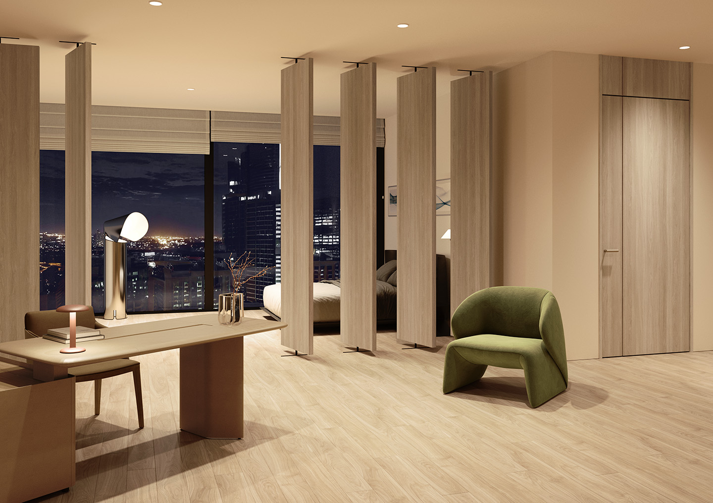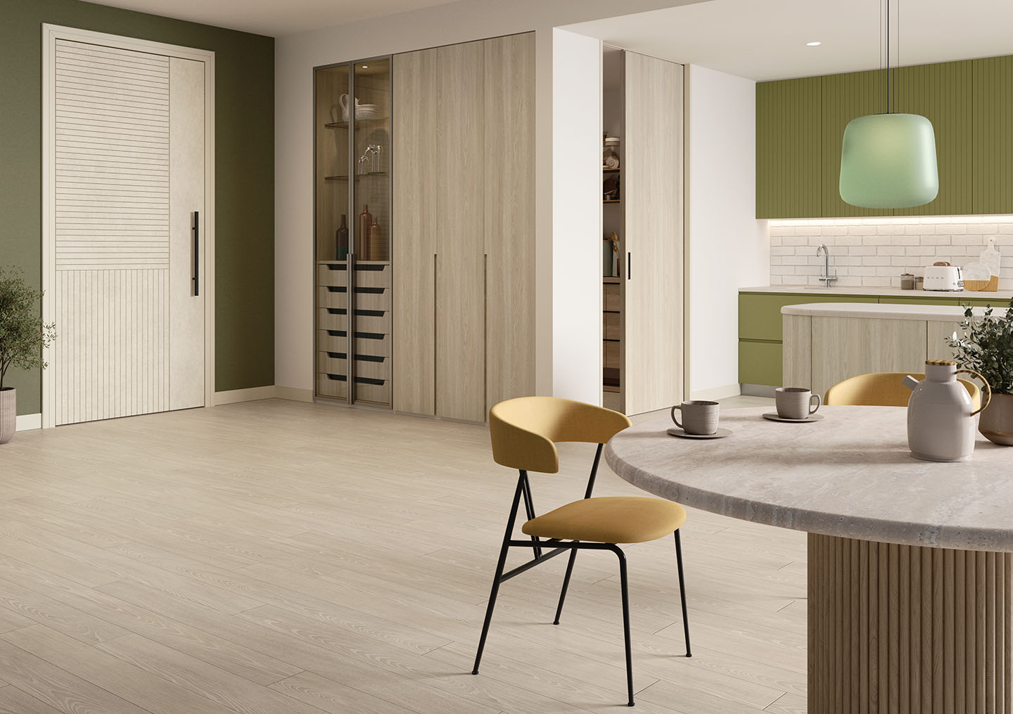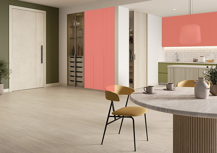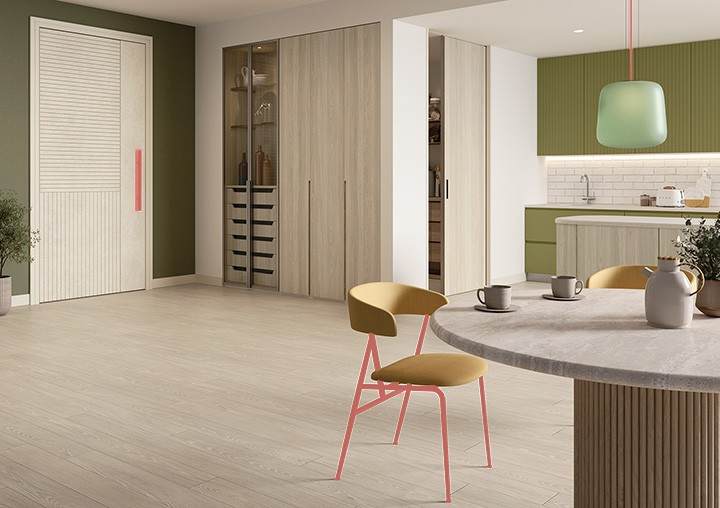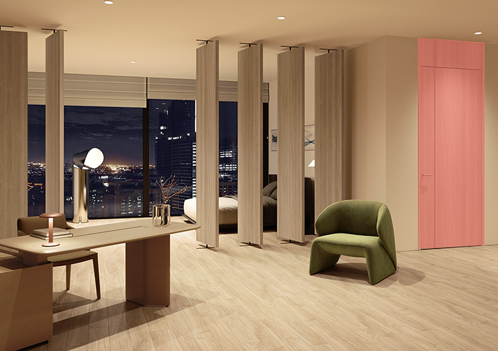 ここ数年、ミラノサローネでも良く見られている縦溝が入った木質表現のフルーテッド加工を取り入れた建具です。単色ではなく、今年の新柄のエポックフィールを使っているため、見え方による質感の違いも感じられます。 |