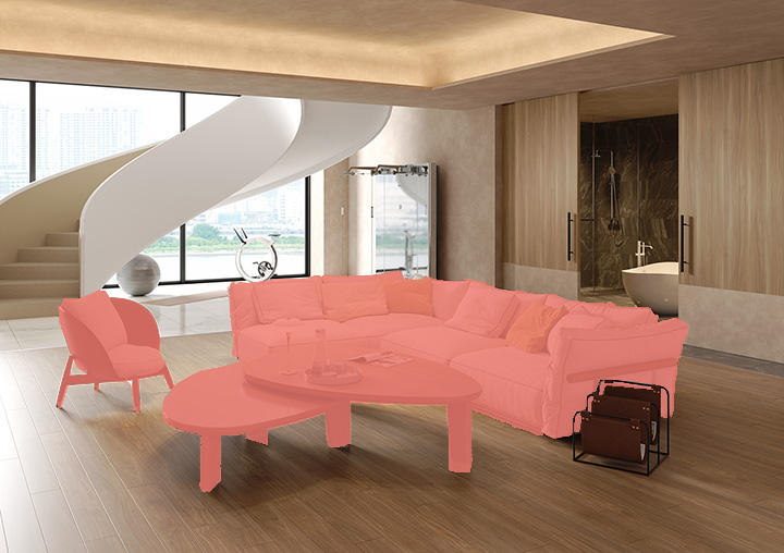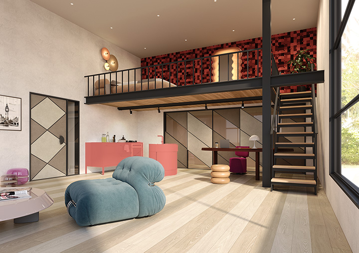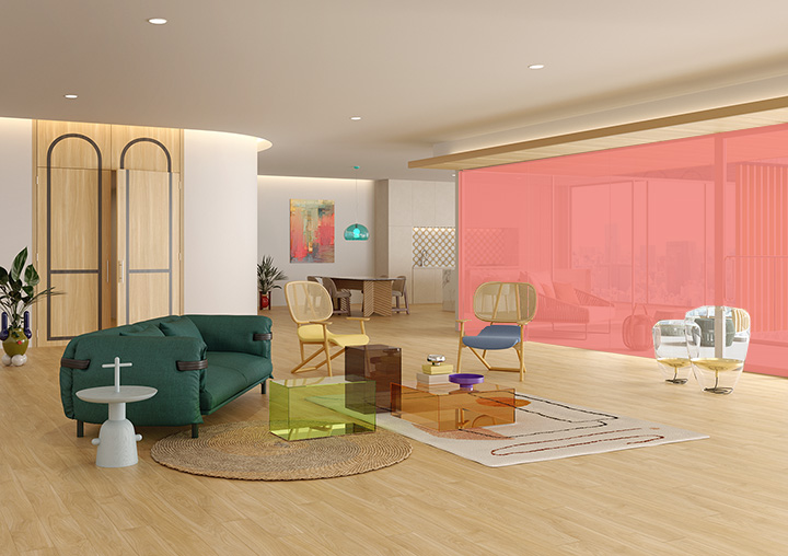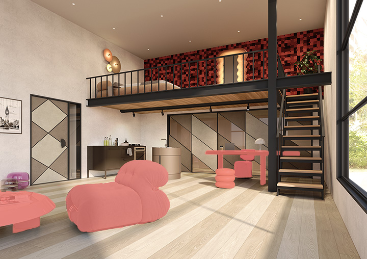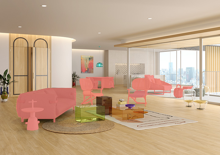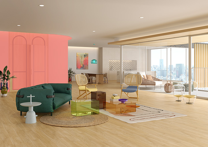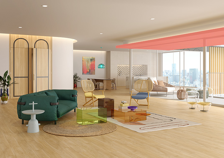 家具はスペイン出身デザイナーPatricia UrquiolaがデザインしたBelt Sofa、Armchair Klara、Dining Table Rowsのほか、Jaime HayonがデザインしたRéaction Poétiqueなどを選びました。ポジティブな感情を引き出す楽し気なインテリアデザインは、新しいナチュラルスタイルの空間を創り出し、アクティブなファミリーライフを想起させます。 |