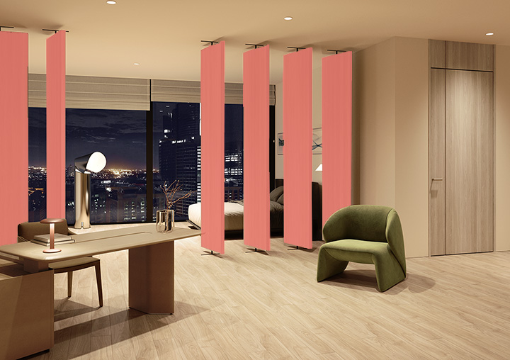 執務エリアと寝室を可動式のパーティションで空間をゆるやかに仕切っています。角度によって視線をフレキシブルに制御できます。 |
