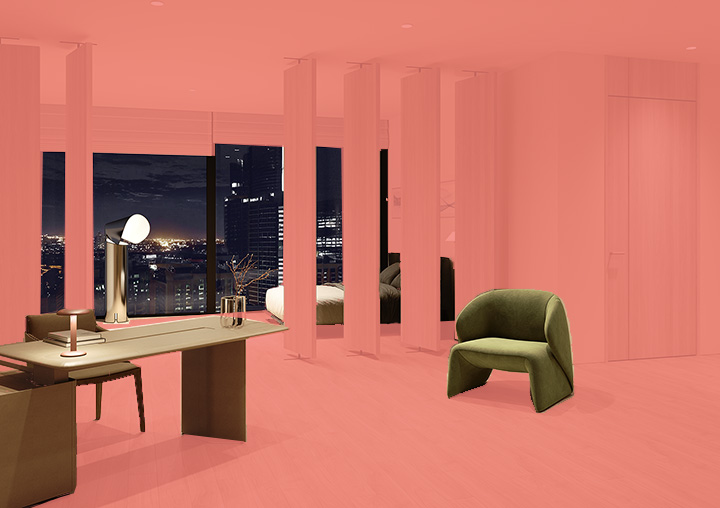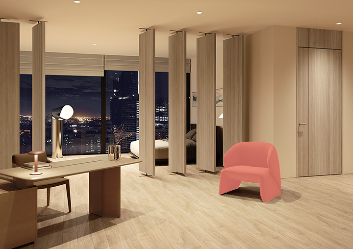 静かで上質なラグジュアリー空間を表現するため、特徴的なアクセントカラーは避け、全体的に明るいグレージュ空間でまとめました。アームチェアが唯一、イエローグリーンのカラーをまとい、空間にさりげない華やかさを与えています。 |