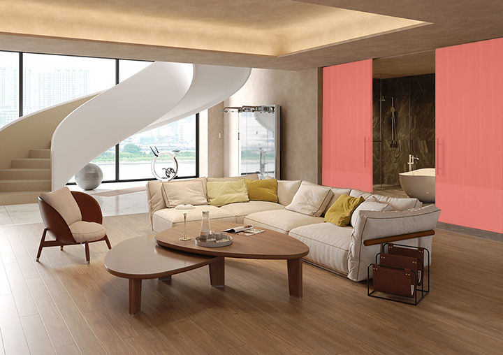 EBコーティングで、美しい鏡面性と油性マジックなどの汚れも乾拭きでき、加工性に優れているため、美しい仕上げが可能な化粧板です。Vカット加工が可能な化粧板とラッピング扉(1R・J型手掛けなど)をご用意しています。ハイグレードな建具・収納扉などにご利用いただけます。