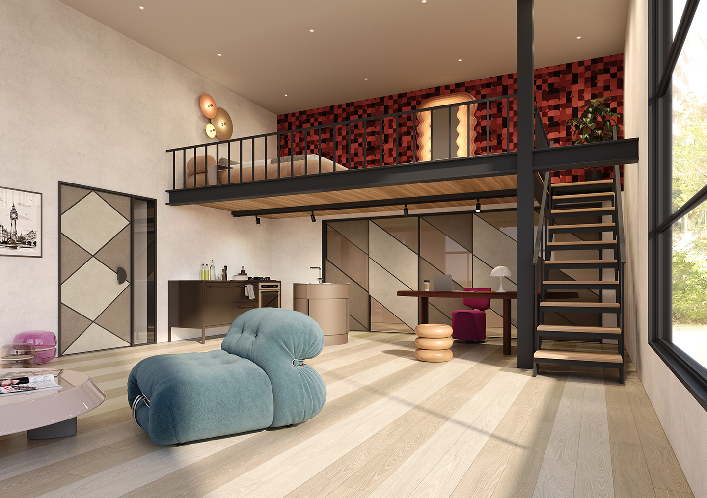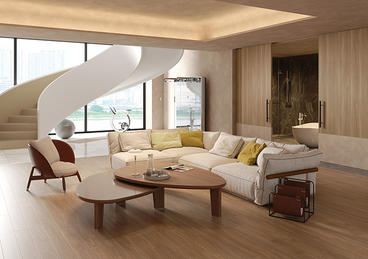 2025年のTastyは「Blissful Living(至福のプライベートタイム)」をスタイルのテーマにしました。ここに暮らす人だけが体感できる極上のプライベート空間で、ホテルライクなラグジュアリースタイルをイメージしました。Tastyのペルソナについては、 こちら (新柄ラインナップ2025)をご覧ください。(國東)