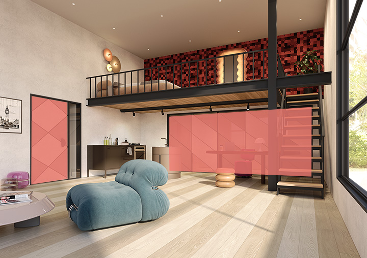 この空間の一番ポイントになっているのは、2つのマテリアルで構成された建具と収納扉です。ジオメトリックパターンで大胆に構成された面材は、個性的な家具にも負けない存在感があります。 |
