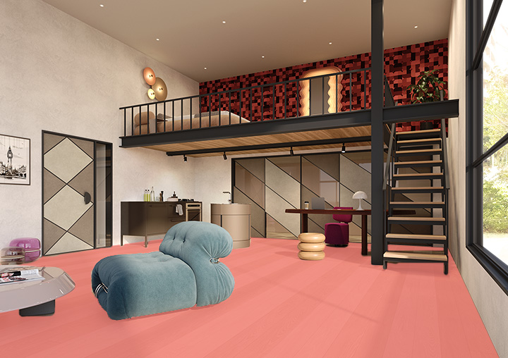 ナチュラルトーンのエルム柄(WS-5262E)をベースに、ダーク色の木目のラインを取り入れました。スペインの寄木細工を想起させるようなデザインにしています。 |