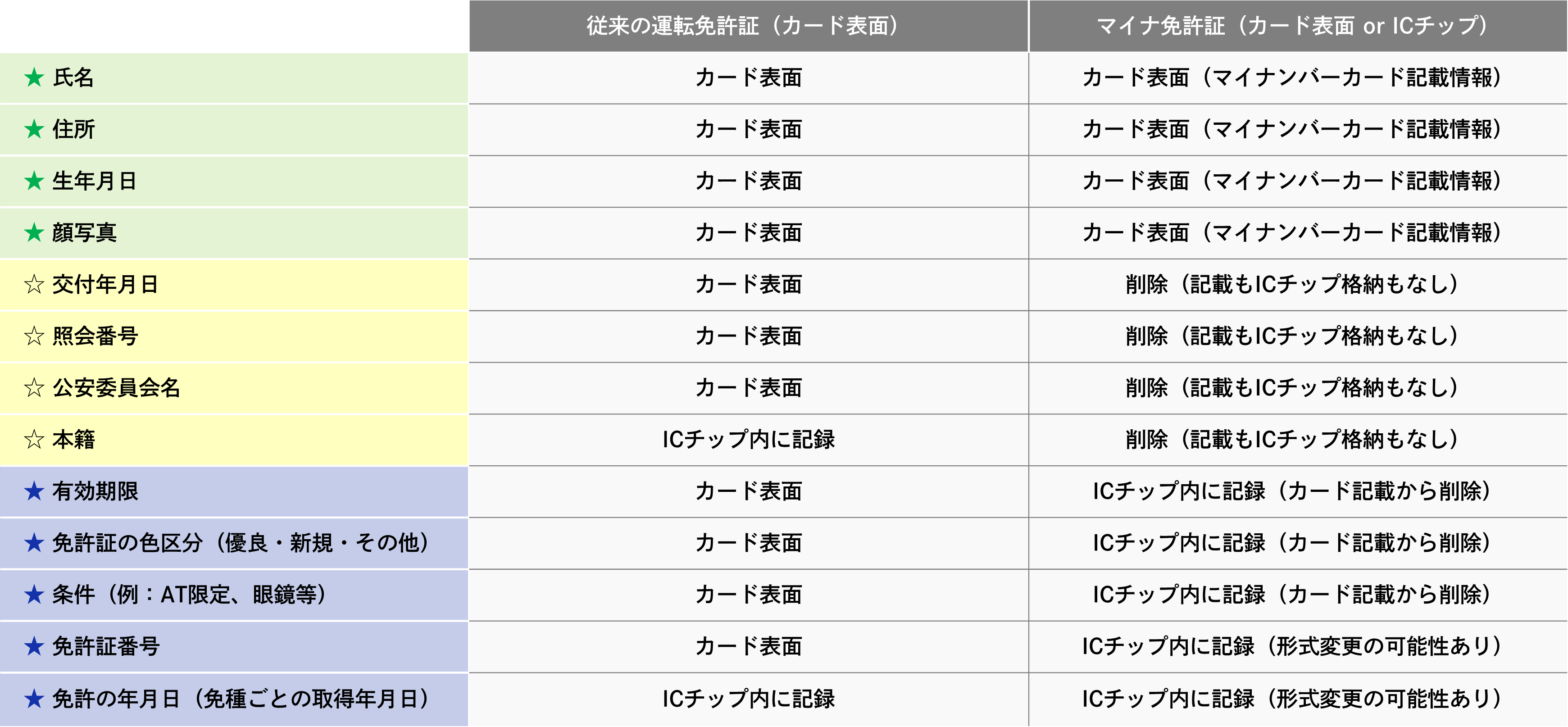 従来の運転免許証とマイナ免許証の書き込み情報の違い