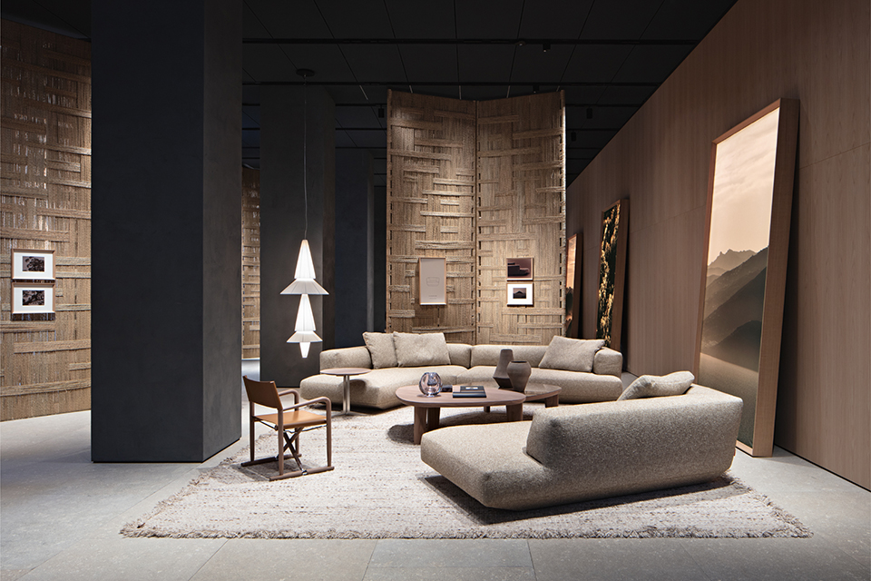 ミラノのモスコーヴァ通り33番地にあるフラッグシップストアにて”INTERIOR LANDSCAPES”を発表しました。優れたデザイン家具とは、空間を彩る存在を超え、屋内・屋外を問わず、視覚的にも感情的にも豊かな風景を形づくる一部である、というFlexformの思想を反映しています。ショールーム内は、イタリアで昔から親しみのある素材であるイグサを使用した天井高のパーティションで、空間をゆるやかにしきっていました。またアートやデジタル映像を融合させた空間を演出し、 ”INTERIOR LANDSCAPES”の世界に没入できる展示でした。