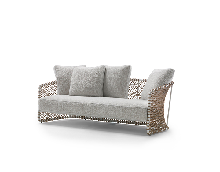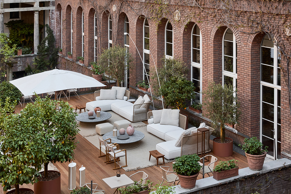 またフラッグシップストアから歩いて10分ほどの場所にあるChiostro Sant’Angelo(キオストロ・サンタンジェロ)にて、新作アウトドアコレクションの展示も開催されました。この歴史的建造物は1920〜40年代のミラノ建築界を代表する巨匠、 ジョヴァンニ・ムツィオによって設計されました。美しい歴史的建築物と中庭に注ぎ込む光、そして爽やかに吹き流れる風を感じながら、Flexformのアウトドア家具を体験できる、素敵な空間になっていました。画像右はAntonio Citterioデザインの新作アウトドア家具のOASISから独立型のソファです。メッシュ状の編みこみが施されたメタル製のバックレストが特徴のデザインです。同じデザインでラウンジチェアダイニングチェアも展開されています。
