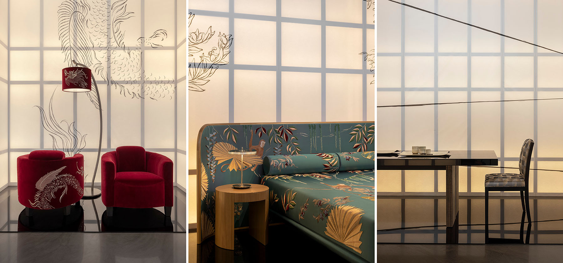 画像左、中央のサテンやベルベットに手刺繍が施された限定作品群では、最大50種もの素材(スパンコール、シルクとメタリックファイバー、ガラスビーズ、ウールサテン、シルクオーガンジーなど)が用いられているそうです。画像中央に見られる、猿の刺繍は立体感と毛色の変化を絶妙に表現しており、近くで見るとその緻密さに驚くほどでした。猿1匹を描くのに70時間以上を費やし、職人の手で刺繍がほどこされているそうです。画像右のテーブル「TROCADERO」の天板は大理石のような艶を持つ黒漆に、真鍮フィラメントで幾何学模様を描いた繊細なデザインです。脚は、よく見ると畳のような質感で構成されています。リキッド・メタル・タタミというマテリアルで、レーザー加工とメタル塗装により畳とメタリックな表情が融合したユニークな質感を生み出しています。展示全体を通し、まるでオートクチュールのドレスがそのまま家具になったような、ARMANI / CASAらしい高い意匠性とクラフトマンシップを感じさせる展示でした。