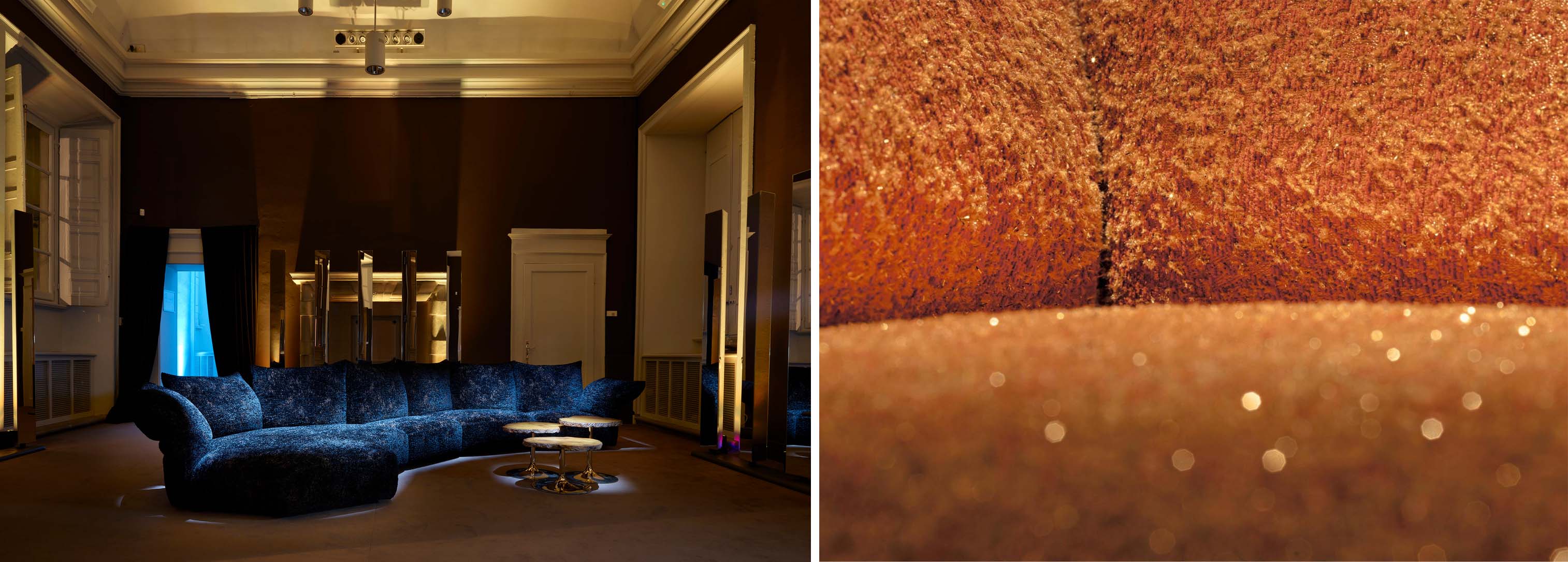 展示では宝石のように輝く新素材のファブリックが目を惹きます。今回披露された9種類の新しいファブリックは、どれもまるで天然石の原石をそのまま織り込んだような存在感で、密度のある色と煌めく糸が生む光の層がEdraのソファやチェアの独特な曲線に寄り添うことで、その造形美を豊かに引き立てています。