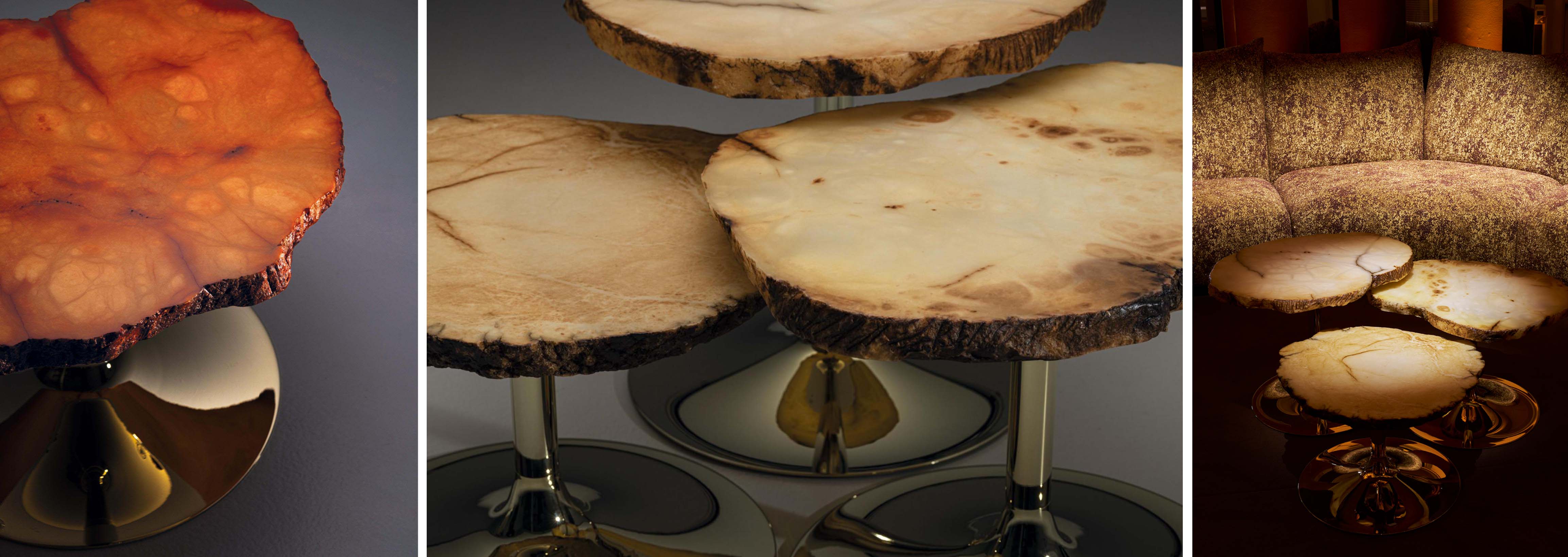 自然が作り出したアラバスターのノジュールからなるコーヒーテーブル「Cicladi」。全ての天板が一点もの。ヴォルテッラ地方特有のアラバスターは、偶然が生んだ芸術品です。今年は新たにゴールドとカーネリアンの2色が追加され、ベースはゴールド、パラジウム、ルテニウムの3種類から、高さは異なる3種類から選択可能。唯一無二の輪郭と模様が空間を彩ります。