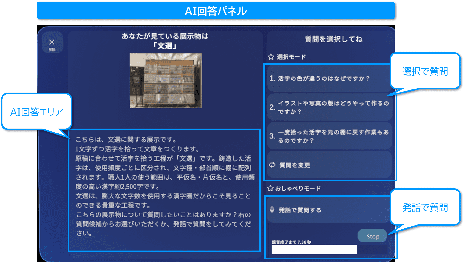展示物に関する質問を選択形式と自由発話形式で行うことができ、AIとの対話を通して展示物の理解を深めることができます。