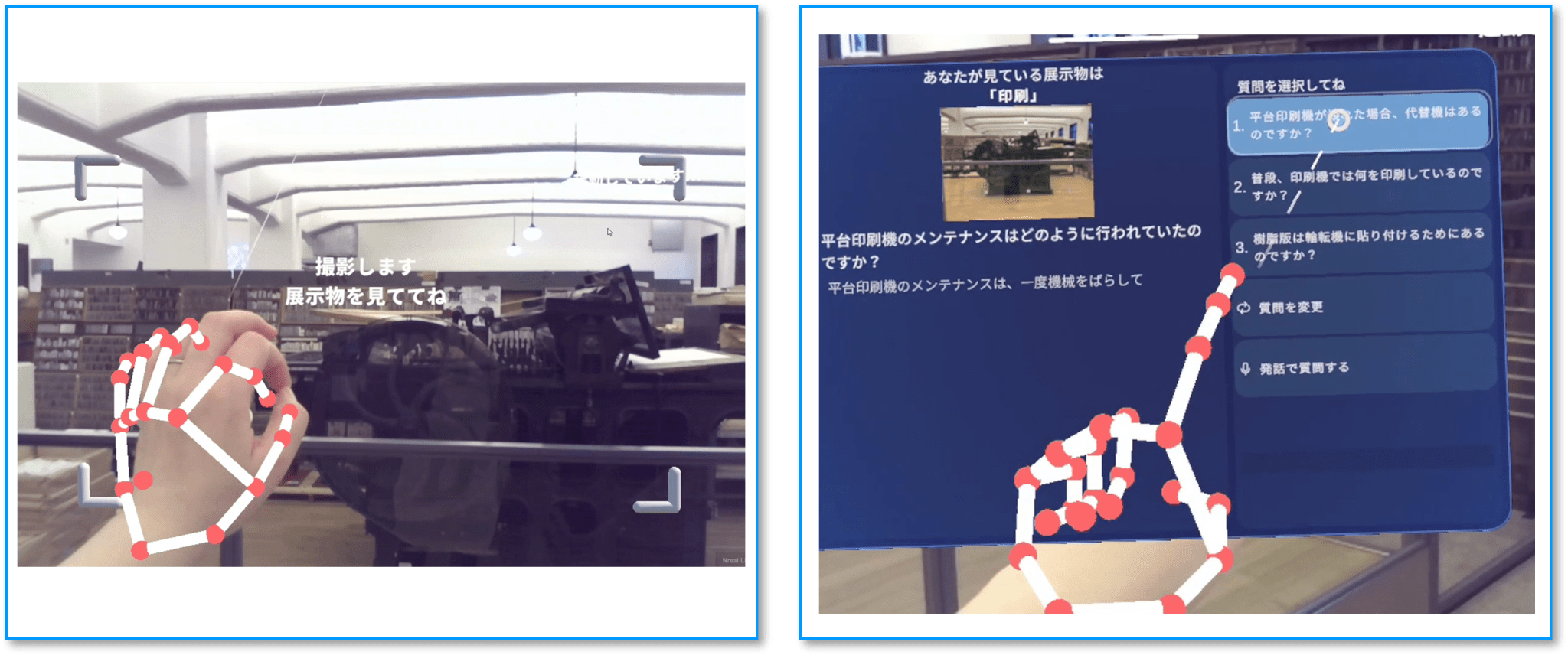スマートグラスを装着し、鑑賞している展示物をハンドジェスチャーで撮影、展示物の横に操作パネルが表示され、その展示物に関する音声解説が自動で流れます。