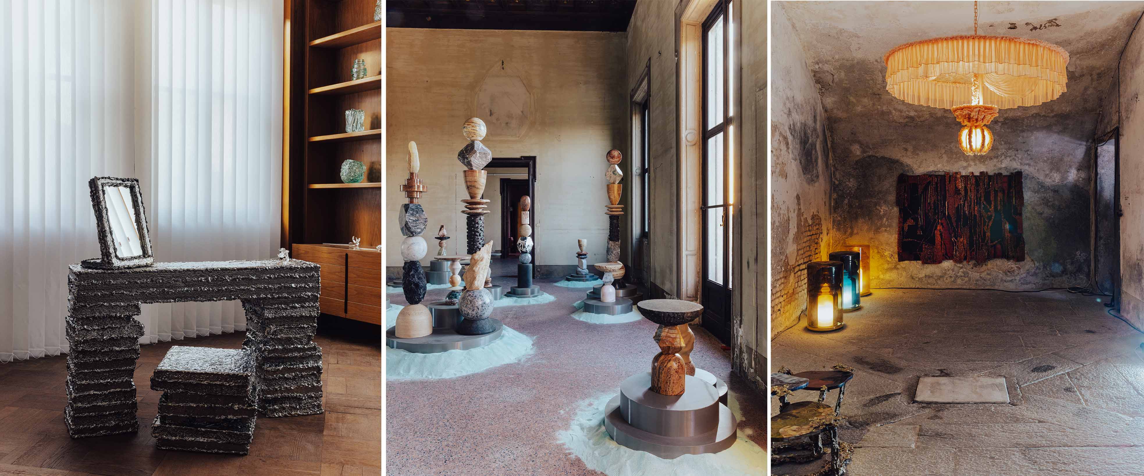 Elle Decor ItaliaはPatricia Urquiolaのキュレーションで「Elle Decor Alchemica」を開催しました。テーマは錬金術。錬金術を実験の場ととらえ、科学と魔法、自然と人工の間の分野として、絶えず進化する社会のリズムをインスタレーションとして表現しました。展示は、錬金術の基本的な3つのプロセスである「ニグレド(黒化)」、「アルベド(白化)」、「ルベド(赤化)」を中心に展開。画像左からIntroductory Gallery、Corridoio Alchemico。画像右は錬金術の初期のプロセスである黒化を象徴し、バスルームを表現したNIGREDO SOLVET / Ambiente Bagnoです。