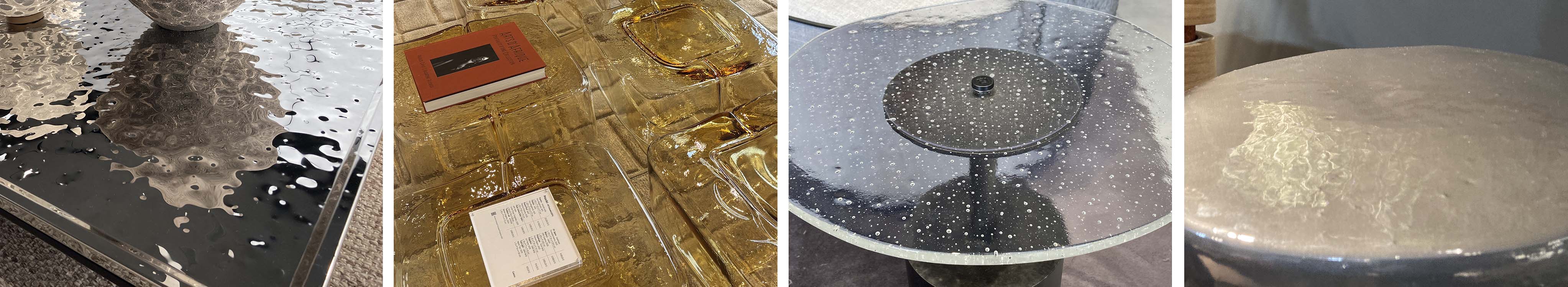 ユーロルーチェの年は体感として照明の効果を引き立てるグロス仕上げの展示が増える印象があります。2025年のミラノデザインウィークもハイグロス、鏡面仕上げによる高級感を感じさせる家具が多数見られました。また水面のように波打ったテーブル天板や光を透過することにより美しい影が落ちるガラス天板なども多く登場しています。