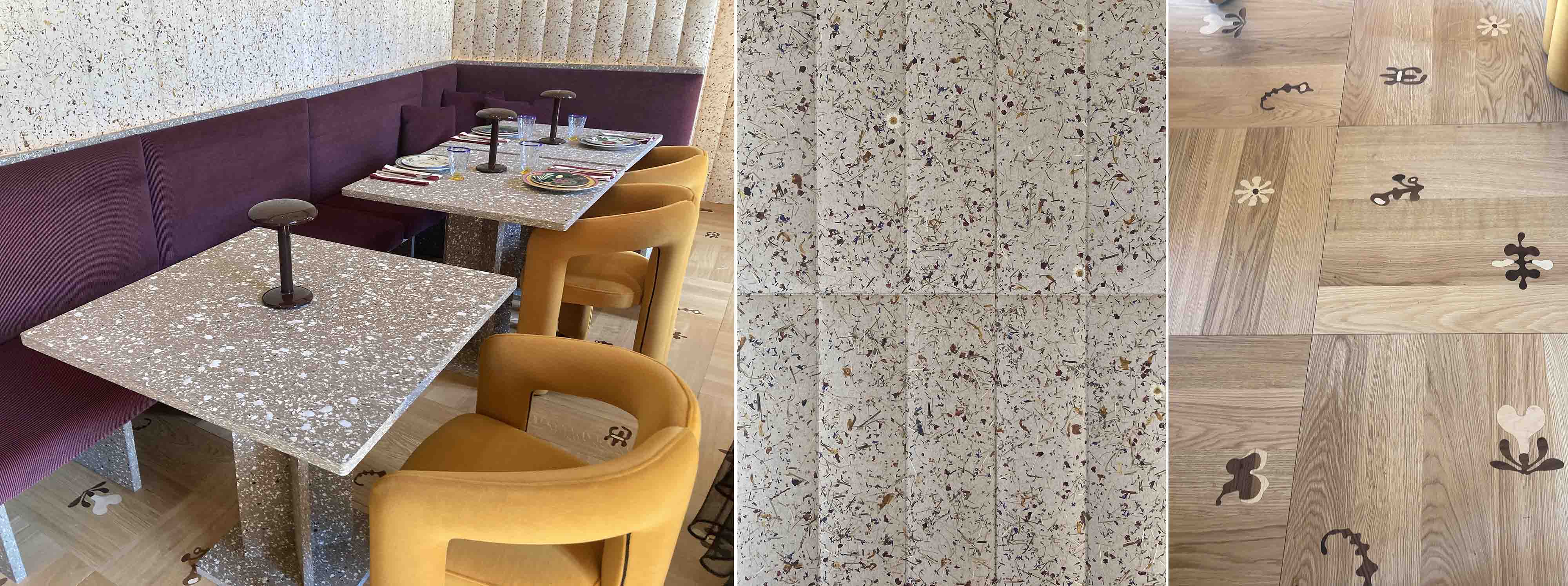 画像下はHERBARIUM RESTAURANT。吸音機能を持つ壁面は、天然繊維や木材などバイオベースで作られた100%リサイクル可能なSlalomの素材が使われています。ソファや椅子の張地に使用されたパープルとイエローの張地が壁面材のカラーとリンクし、どことなくパンジーやビオラの花を想起させ、空間のテーマである植物の標本の中に紛れ込んだような感覚を得ました。Patricia UrquiolaがデザインしたOR.Namiのパーケットフローリングも、可愛らしいデザインでこの空間にぴったりでした。