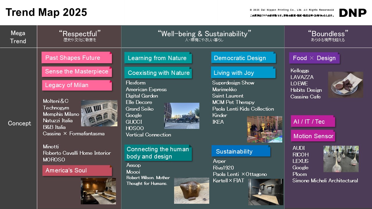 DNPでは取材したブランドが提示していたコンセプト、それを表現していたインテリアコーディネート、そしてそのコーディネートを構成するCMFという順序でトレンドの分析をしています。それぞれのブランドが自信を持って発信していた新たなトレンドの“点”を、DNPの視点で“線”として解釈し、今後の方向性を予測しています。