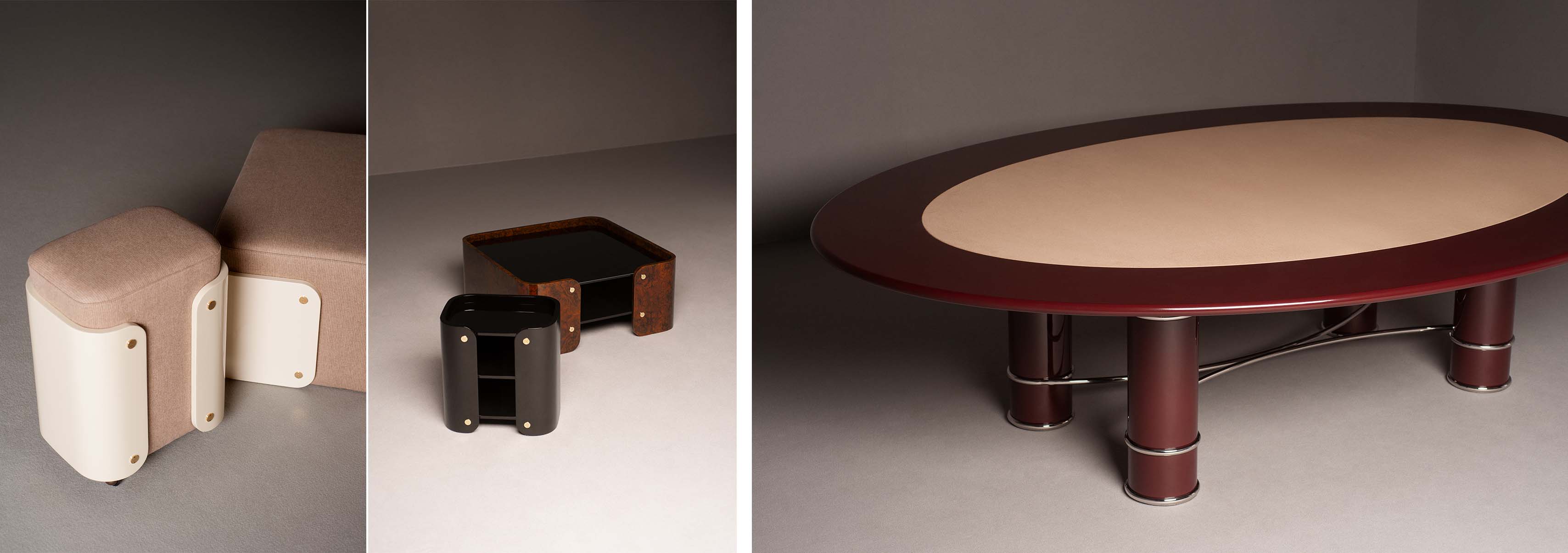 Dimoremilanoによる新作家具を3点ご紹介します。画像左は、新作のプフ「クアローナ」。ファブリックを包み込むような木製パネルの曲線美が特徴です。使用されているファブリックには、カシミヤやインカ産のアルパカとウールが用いられており、画像中央の「クアローナ」コーヒーテーブルの洗練されたデザインと美しく調和しています。画像右は、漆によるラッカー仕上げが施された木製テーブル「ヴァルセージア」。中央にはLoro Pianaのファブリックがあしらわれ、脚部のスチールチューブが印象的なアクセントになっています。いずれの製品も、Loro Pianaの上質なファブリックがもたらす柔らかな心地よさと、木材や金属といった硬質な素材でありながらも有機的なフォルムを描くエレガンスを兼ね備えたデザインになっています。