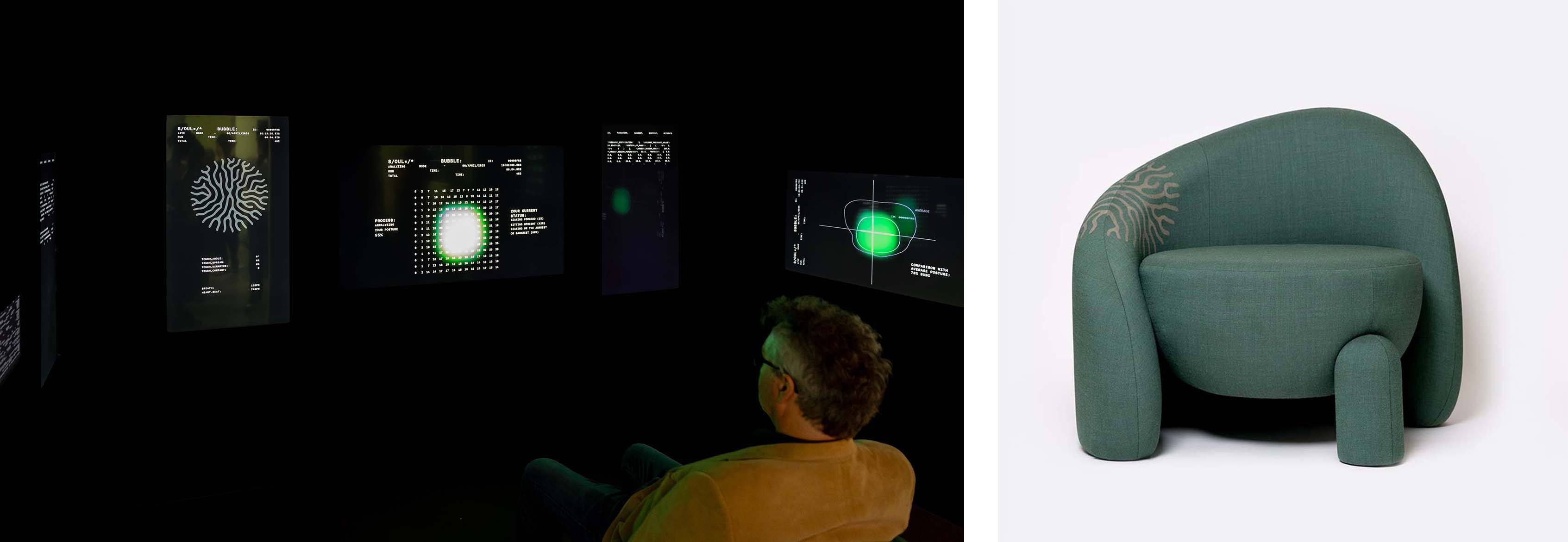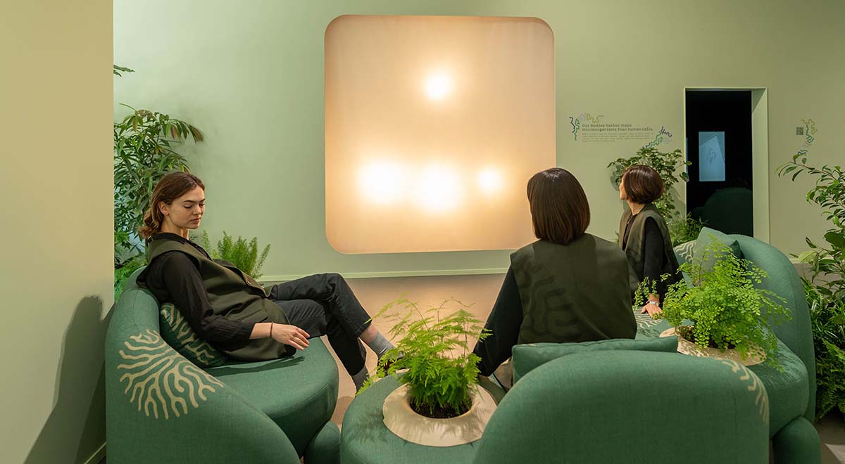 2025年、ミラノデザインウィーク初出展となったRICOHは「SOUL/SOIL-見えないものデザインする」のコンセプトのもと、世界初となる導電性インクの大判プリント技術とAIを掛け合わせることにより、あらゆるファブリックに特別なセンシング機能を付与した革新的なソリューションを提案していました。ファブリックのパターンデザインのモチーフには、微生物の「チューリングパターン」を取り入れることで、私たちの体内や身の回りに無数に存在し私たちの健康や行動に大きな影響を与える微生物とのつながりを表現しています。SOUL(人の心)とSOIL(土壌・微生物)という目には見えない存在をRICOHの持つテクノロジーとデザイン力を駆使し視覚的にとらえることで、未来の生活を体験できる展示となっていました。