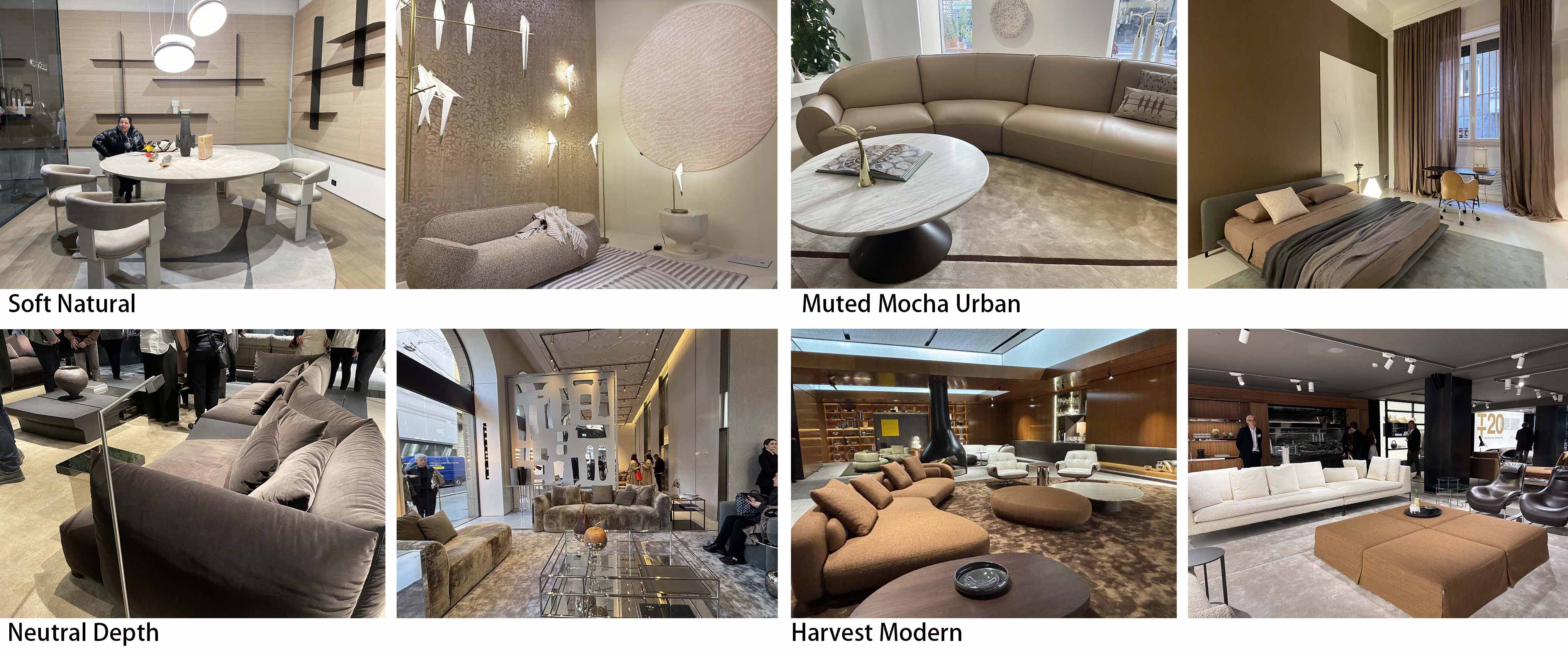 上記でご紹介したコンセプトを具体的に表現していたインテリアコーディネートのトレンドについて紹介していきます。今年も、ブラウン、ベージュやグレーといった中間色のニュアンスをもつコーディネートが主流となり、2023年からDNPが提唱しているエクレイジュコーディネート(ファブリック、木質を含むさまざまな素材に見られたホワイト、ベージュなどのライト系、またグレイッシュ、中間色のニュアンスが含まれるコーディネート)が今年もさまざまなブランドで見られました。そのなかでも、今回は4つの方向性に分類しました。