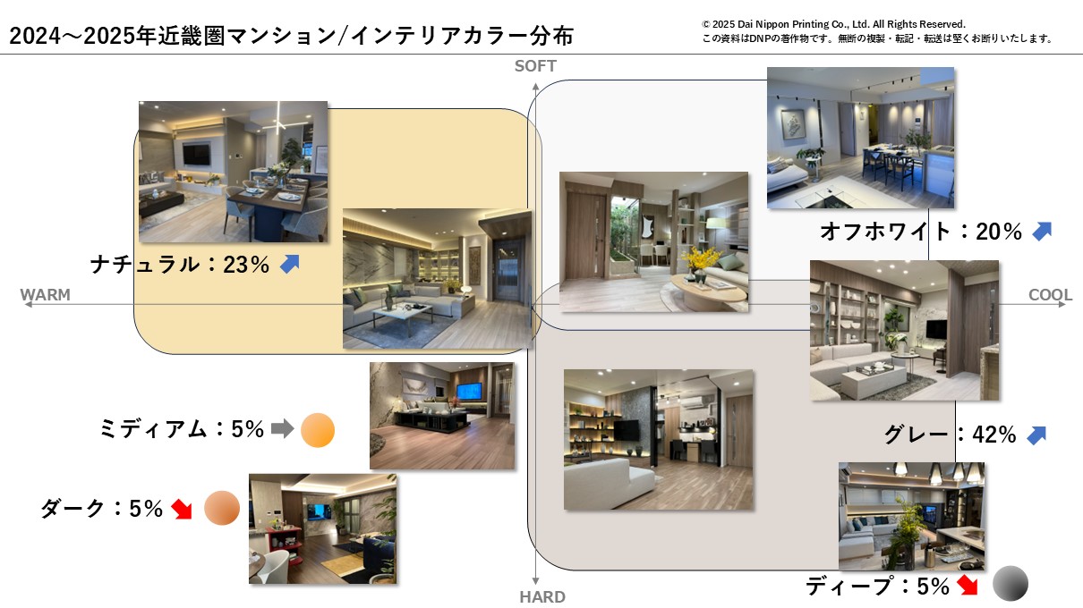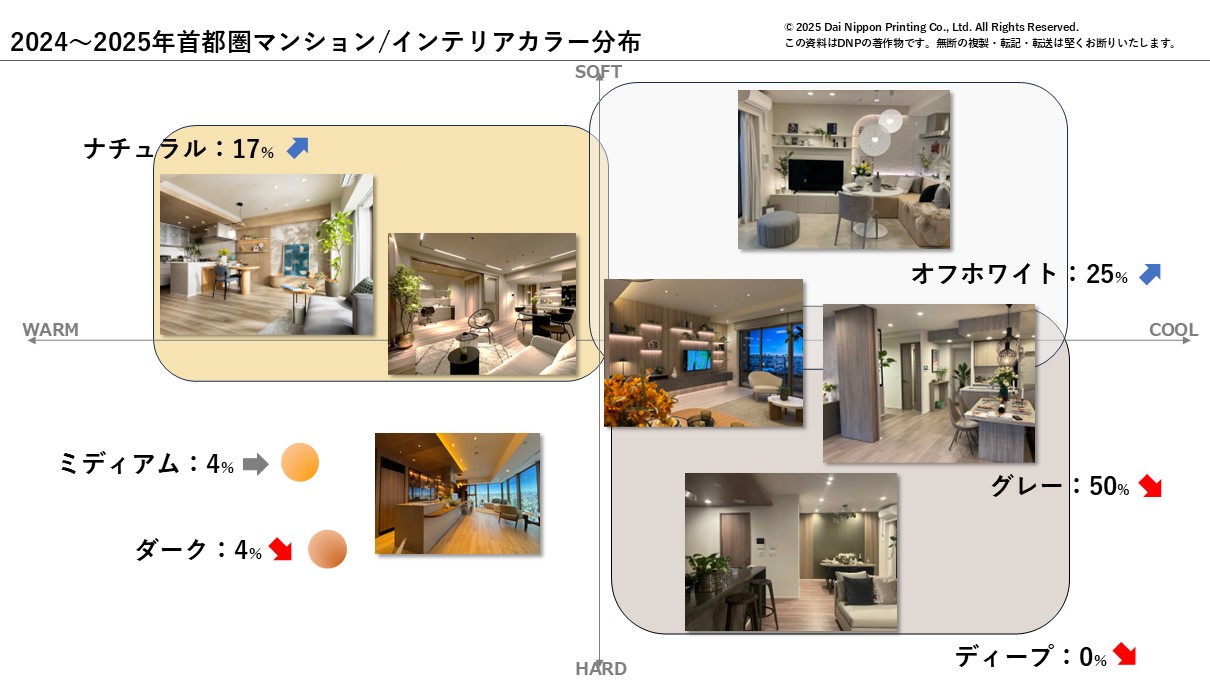 DNPでは、長年にわたりマンションのインテリアトレンド調査を行い、オリジナルブランド製品であるDNP内装用化粧シート「サフマーレWS」やDNPフローリング用化粧シート「BE-F」などの開発に活かしてまいりました。 本コラムでは、2025年7月に開催したセミナー「DNP Design Days 2025 Summer」でご紹介したマンションモデルルーム調査2024~2025から抜粋した内容を、インテリアコーディネーターや建築設計デザインに関わる皆さまに向けてご紹介いたします。