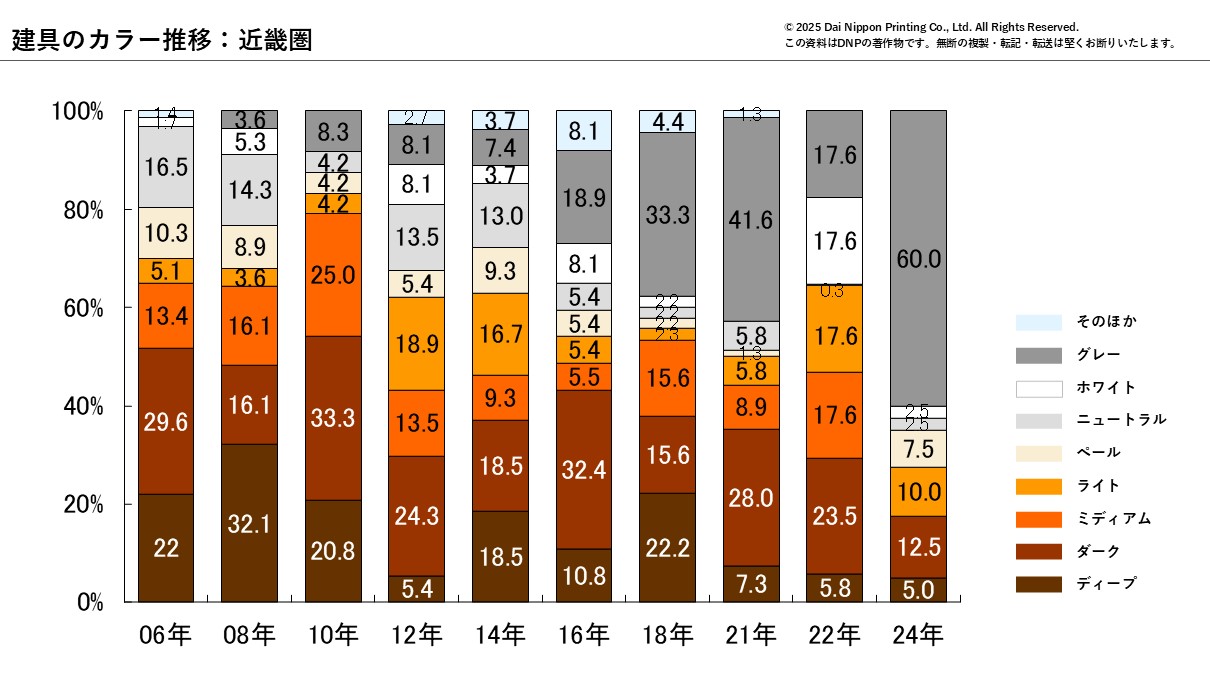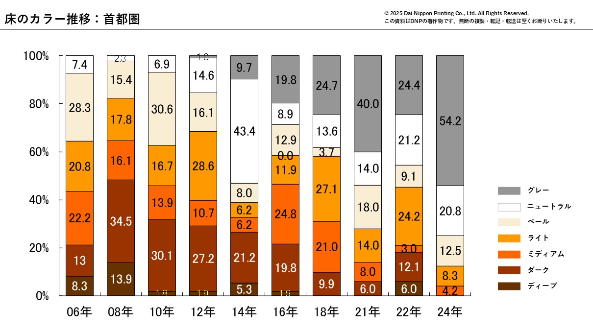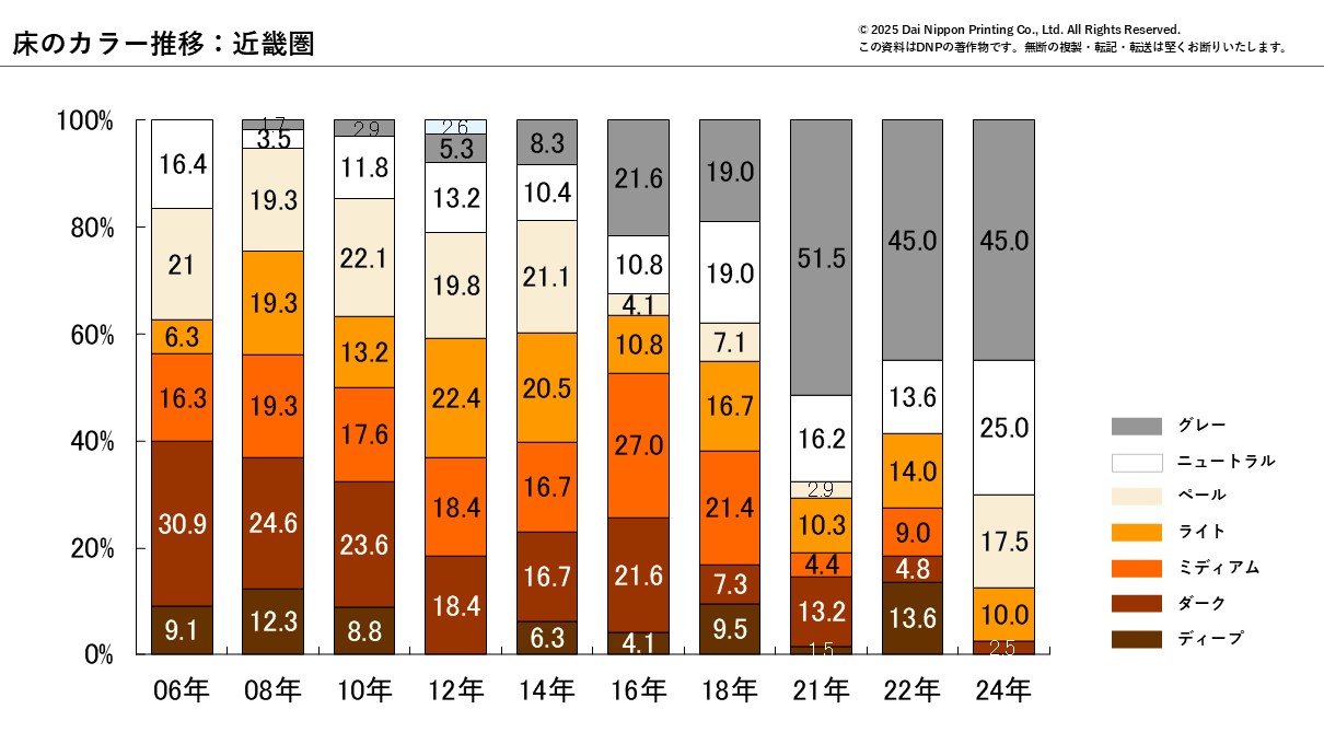 次に、近畿圏における建具と床のカラー変遷です。グレーカラーが頭打ちになった首都圏に比べ、近畿圏では大幅な増加となりました。以前から近畿圏では一定のボリュームで見られたダーク、ディープカラーも近年は減少傾向にあります。床のカラーは、わかりやすい高級感を演出するダーク、ディープカラーがほとんど無くなり、グレー、ニュートラルの無彩色系で70%を占めています。